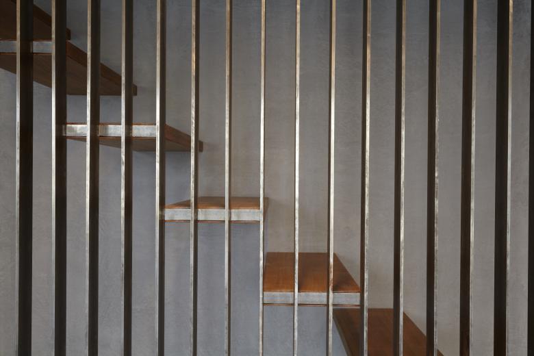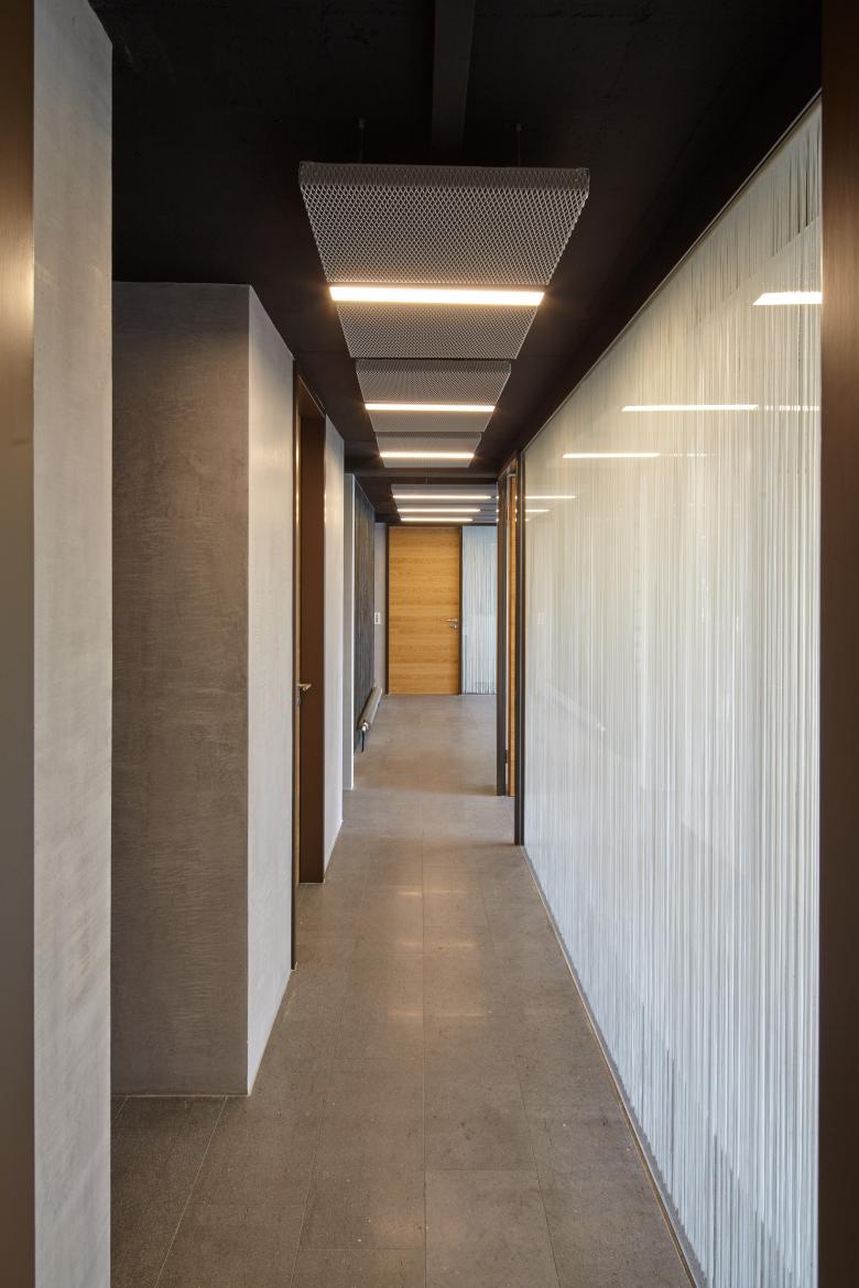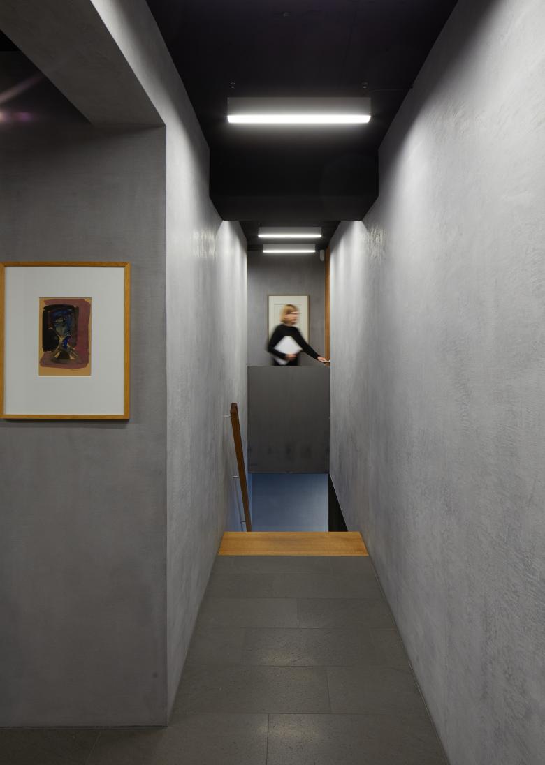 Das vor knapp 50 Jahren errichtete Wohn- und Geschäftshaus ist seit 1968 Sitz des Büros der Architekten Wannenmacher + Möller. Mit der kontinuierlichen Expansion des Unternehmens wurde im Laufe der Zeit immer wieder Wohnungen aufgegeben und dem Büro zugeschlagen. Die daraus resultierenden funktionalen Einschränkungen sollten durch wenige bauliche Veränderungen beseitigt und dabei auch eine gestalterische Auffrischung der Räumlichkeiten vorgenommen werden. Zu diesem Zweck wurden im Erdgeschoss sämtliche abgehängten Rigipsdecken und die das Sekretariat und den Besprechungsraum umgebenden Leichtbauwände entfernt und durch Deckensegel aus Streckmetall bzw. Glaswände ersetzt. Weiße Fadenvorhänge bieten einen Sichtschutz, ohne dabei die Transparenz ganz aufzugeben. Anstelle des Teppichbodens wurde der schon außerhalb des Eingangs liegende Basalt im gesamten Erdgeschoss verlegt. Die neue Treppe sowie die Türen sind aus Eiche, die einen warmen Kontrast bildet zu den eher kühlen Oberflächen von Boden, Wänden und Decke