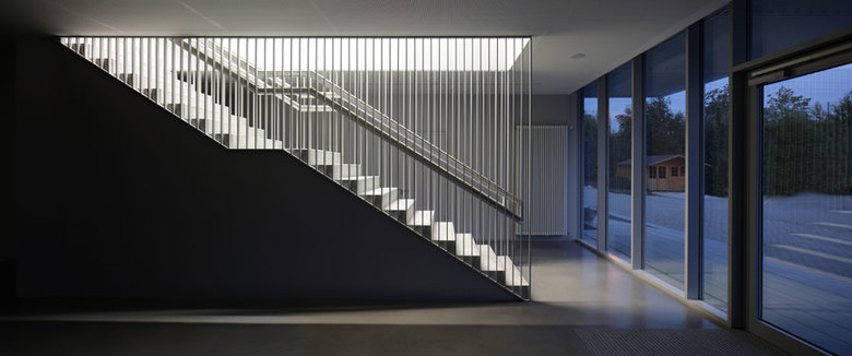 Die neue Sporthalle präsentiert sich als schlichter gläserner Quader. Ihr Eingang ist zur Grundschule hin orientiert und wird durch ein auskragendes Vordach betont. Im Erdgeschoss befinden sich neben dem Foyer die Technikzentrale, Geräteräume sowie ein Vereinsraum. Eine im Foyer gelegene Treppe führt ins Obergeschoss, in dem die Umkleideräume untergebracht sind. Der Erschließungsgang, der die Umkleiden von der Halle trennt, dient auch gleichzeitig als Tribüne. Von ihm aus eröffnet sich ein Panoramablick in die gesamte Halle. Axiale Ausblicke lassen die angrenzenden Freiräume erlebbar werden.