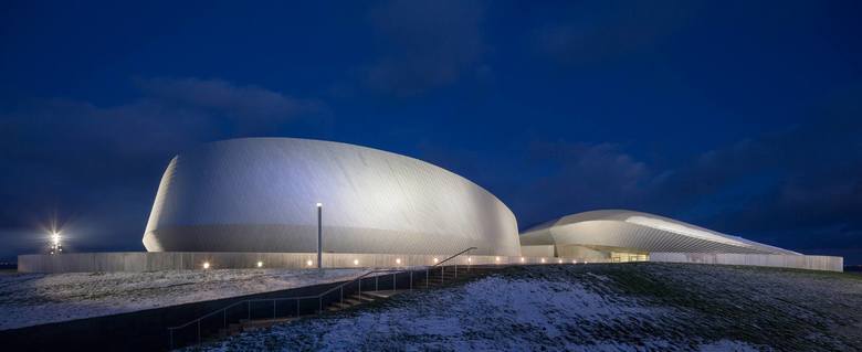 The Blue Planet is located on an elevated headland towards the sea, north of Kastrup Harbor. Located by the seaside the whirlpool shape connects sea and landscape. The building's distinctive shape is clearly visible for travellers arriving by plane at the nearby Copenhagen Airport. The facade is covered with small diamond-shaped aluminum plates, known as shingles, which adapts to the building's organic form. Just as water aluminium reflects the colours and light of the sky and thus the buildings expression varies with the changes in its natural surroundings.