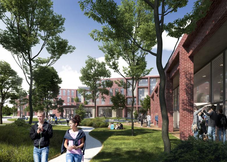 The college consists of four offset buildings, which are connected by atriums up high and further merged together by a wide spectre of communal areas on the ground floor. Here, you will find a reception, a café, a library, administration offices, a dining room and an assembly hall. All these facilities will be gathered along an open alley – the heart of the college. This creates a number of clearly defined environments, each with its own identity, while the sense of community will be emphasized as a consistent element in the everyday life of the college.