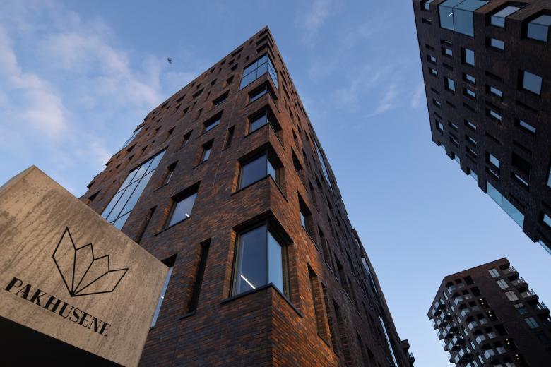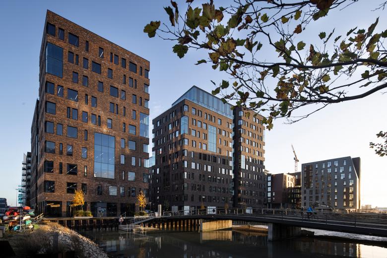 Pakhusene is a striking and innovative construction project in eastern Aarhus; striking by virtue of its stringent lines, tactile brick facades and 40,000 square metres, and innovative by virtue of its focus on harnessing the many possibilities of the sharing economy, making it a sustainable powerhouse focused on community. It is a powerhouse that is teeming with life from early morning to late into the evening, and it is also the first building of the new harbour district to be awarded DGNB Gold certification.