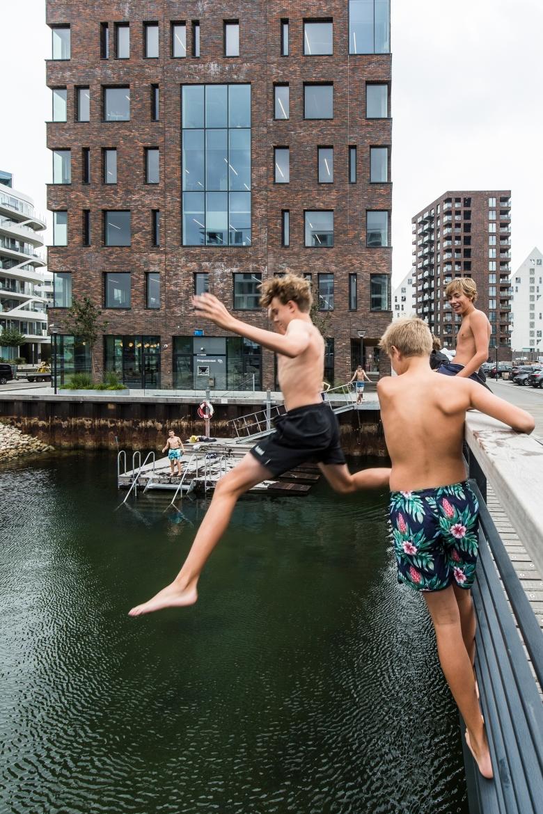Inspired by the sharing economy, companies and residents have the opportunity to share a wide range of facilities such as a fitness centre with a sauna, harbour bathing area, canteen, meeting rooms and a large roof terrace. In the weekends, the meeting rooms can even be booked for social events, and the same goes for the canteen, which has already been used for weddings and confirmations. The overarching focus has been to design a building that is more than the sum of its parts and creates new possibilities for the development of the new harbour district.