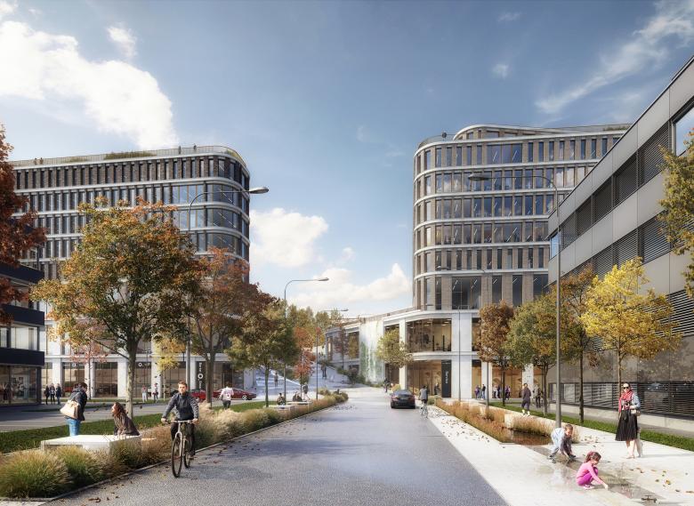 The municipality's desire for a green axis and more pedestrian, bicycle and road connections through the area has guided the design of the office volumes. Due to the level difference, the slope ratio and property boundaries, the axis is placed as a diagonal through the plot. A unifying square will be established on the client's property. The goal has been to create a place that eventually becomes a part of a city, and not a car complex. By thinking of the city, the buildings will be able to change over time, and be used for other functions.
