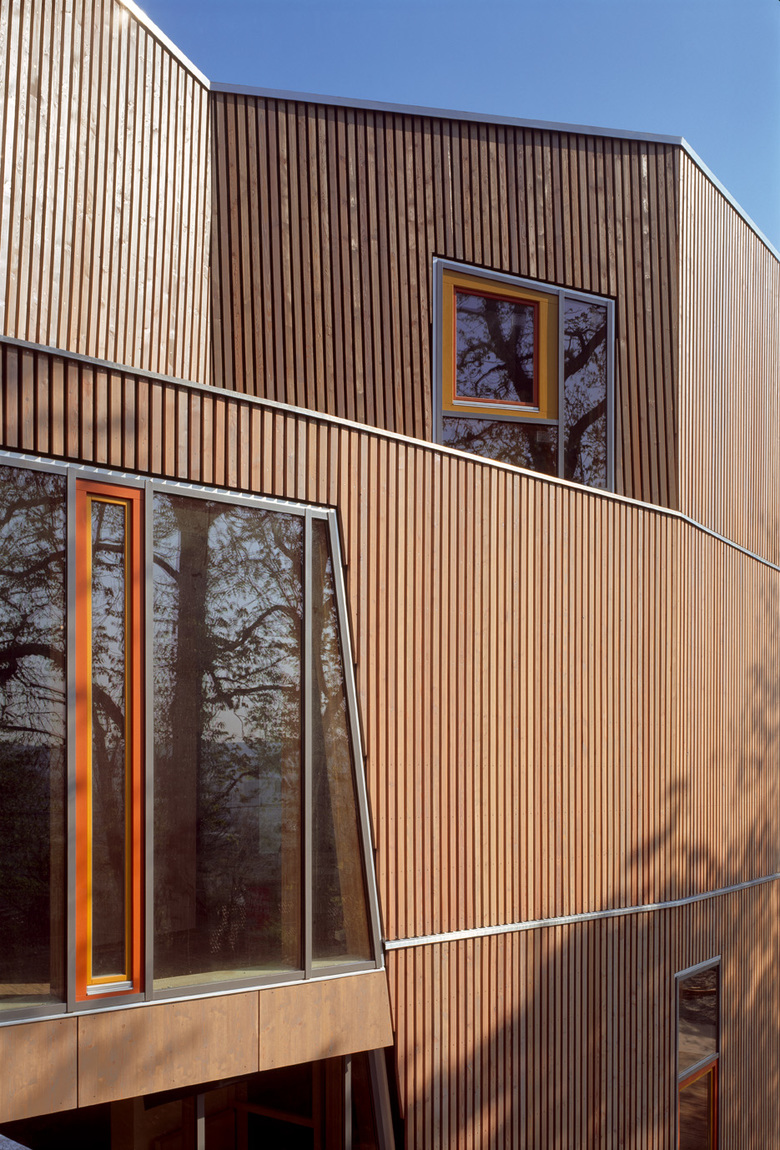 Changierende und variierende Verlegemuster, Profiltiefen und Profilabstände der Lärchenholzfassade erzeugen ein sich mit der Bewegung des Betrachters ständig veränderndes Bild.