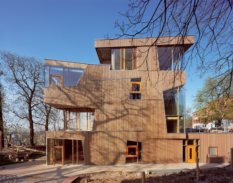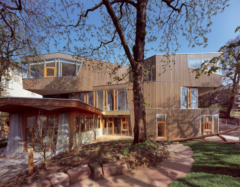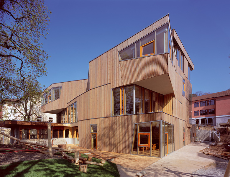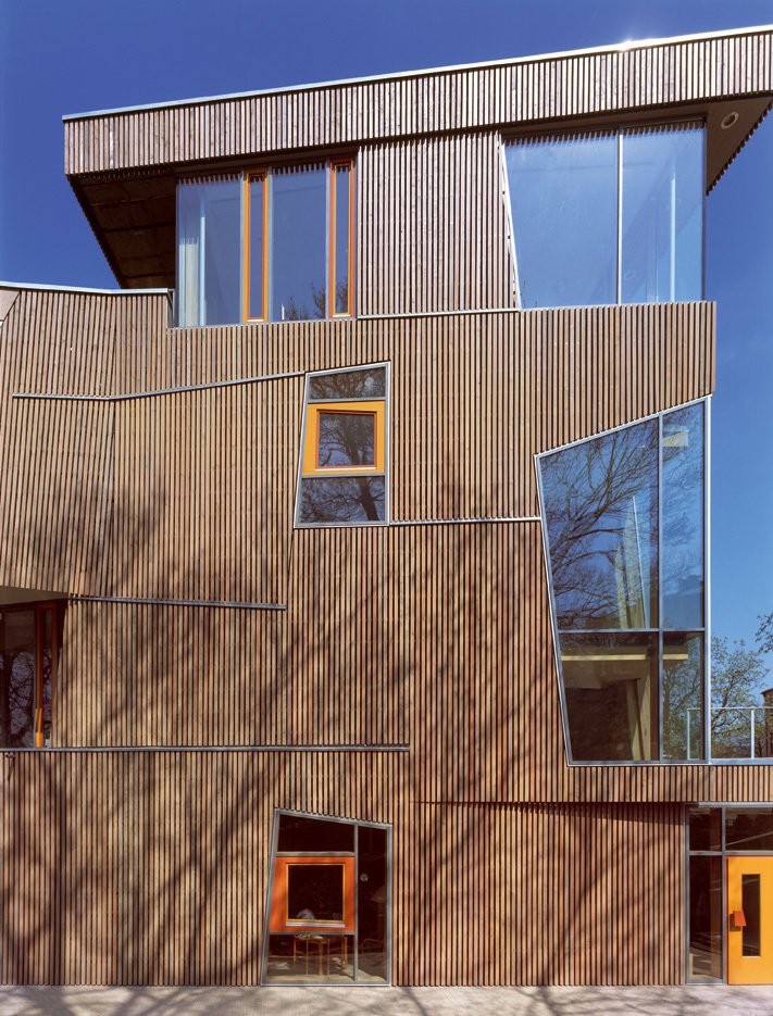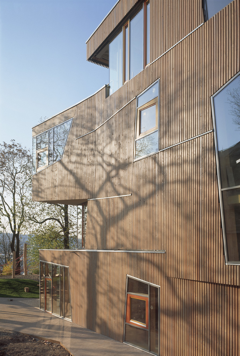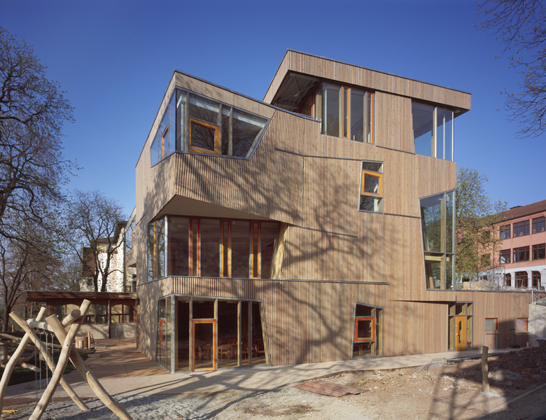 Das neue Hort- und Mensagebäude fügt sich trotz seiner abweichenden Zweckbestimmung hervorragend in die Villenbebauung der Haussmannstraße ein. Großzügige Verglasungen schaffen interessante Ein- und Ausblicke an den prägnanten Stellen des Gebäudes. Die Verkleidung mit Lärchenholzlamellen überzieht das gesamte Haus und stärkt so die ausgezeichnete skulpturale Wirkung des Baukörpers. Durch die fein abgestimmten Lasuren der Beton- und Holzoberflächen im Innern entstehen helle freundliche Räume mit hoher Aufenthaltsqualität.