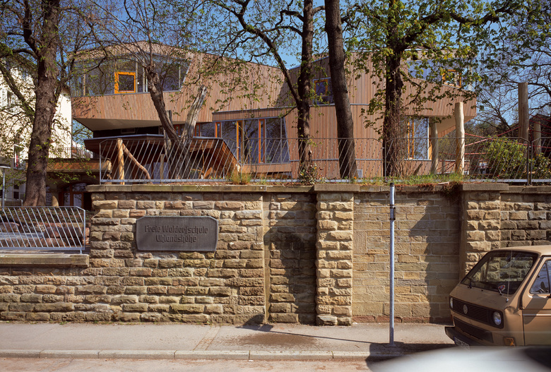 Die Ergänzung und Erweiterung der Ganztagesbetreuung durch das Hort- und Mensagebäude auf dem weitläufigen Campus der Waldorfschule Uhlandshöhe wurde im Rahmen des IZBB-Förderprogramms des Bundes und der Länder zum Ausbau der Ganztagesbetreuung an Schulen unterstützt. Der Bau, der einen Ersatz für die in die Jahre gekommene „Hortbaracke“ darstellt, besetzt wie eine Landmarke diesen Ort.