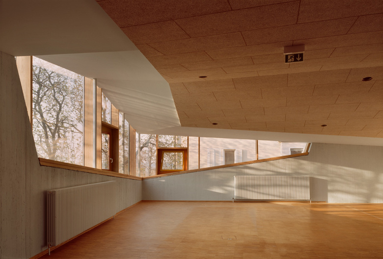 Die hellen, freundlichen und offenen Horträume, Mensaflächen und Arbeitsplätze mit großzügigen Verglasungen ermöglichen Aus- und Durchblicke, konzentriertes Spielen und Lernen sowie ein entspanntes, anregendes Einnehmen der Mahlzeiten. Im Kontrast zu den großzügigen Glasflächen steht die Lärchenholzbekleidung der Fassade, die farbig lasierten Sichtbetonoberflächen sowie die hölzernen Einbaumöbel. Diese sorgen für eine warme und freundliche Atmosphäre.