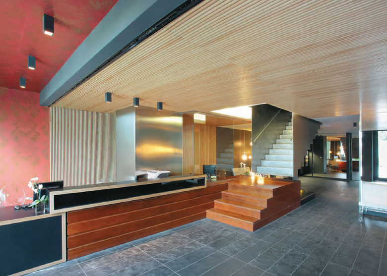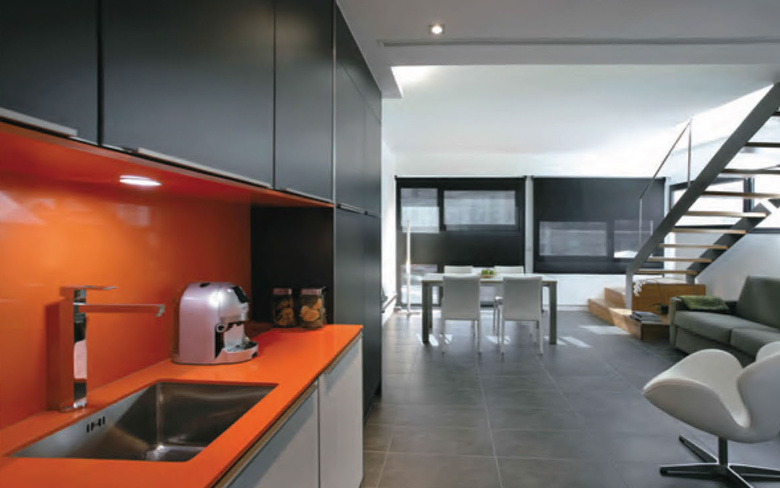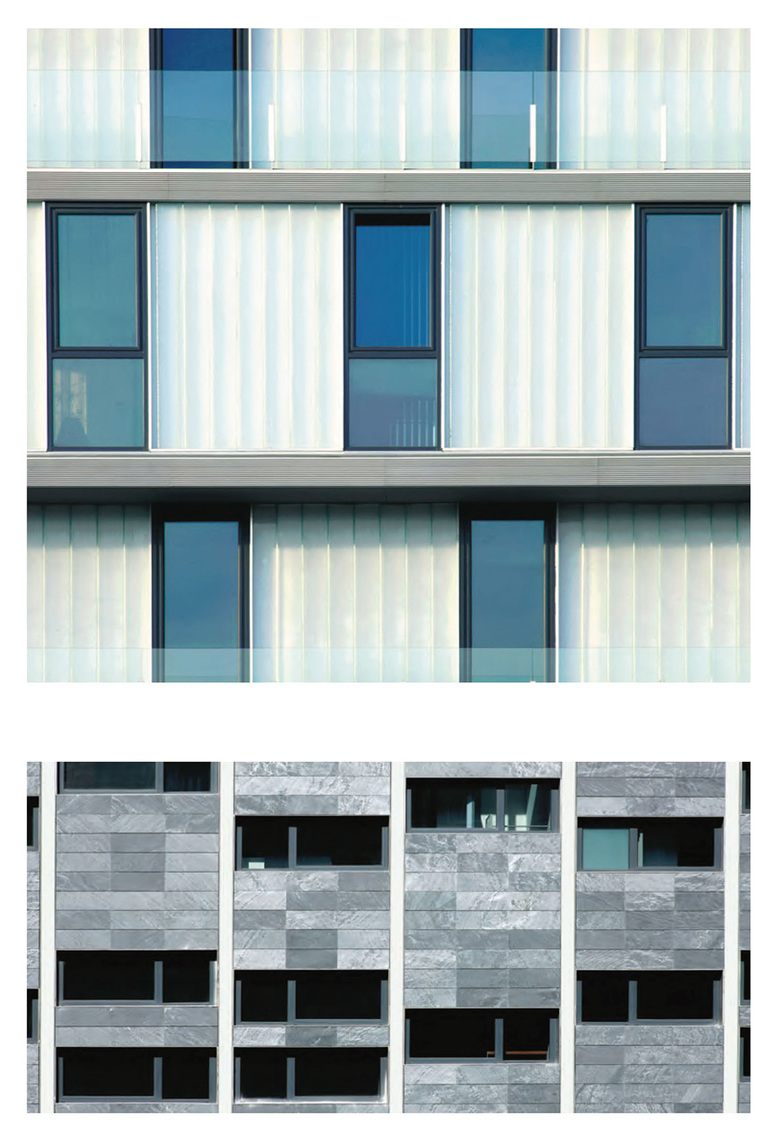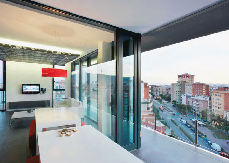A second building comprising three duplex apartments connects the building with the residential fabric of the Sants district. The facade of the tower consists of aluminum slats and U-glass elements. This tower is the first apartment building in Barcelona featuring an independent spring structure, which dampen vibrations caused by trains arriving at the station which pass close to the basement level.