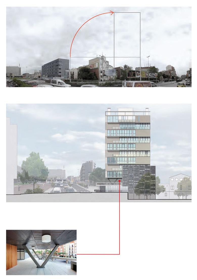 The proximity of the central Sants station places the project in a strategic location and makes it a landmark in the urban landscape. The planning regulations proposed a linear building featuring a 70m facade along the promenade. The solution adopted, however, straightens this built-up barrier and transforms it into a square ten-story tower. This frees up the ground-level space required to create a ramp and stairs to connect one side with the other, while creating a neighbourhood courtyard.