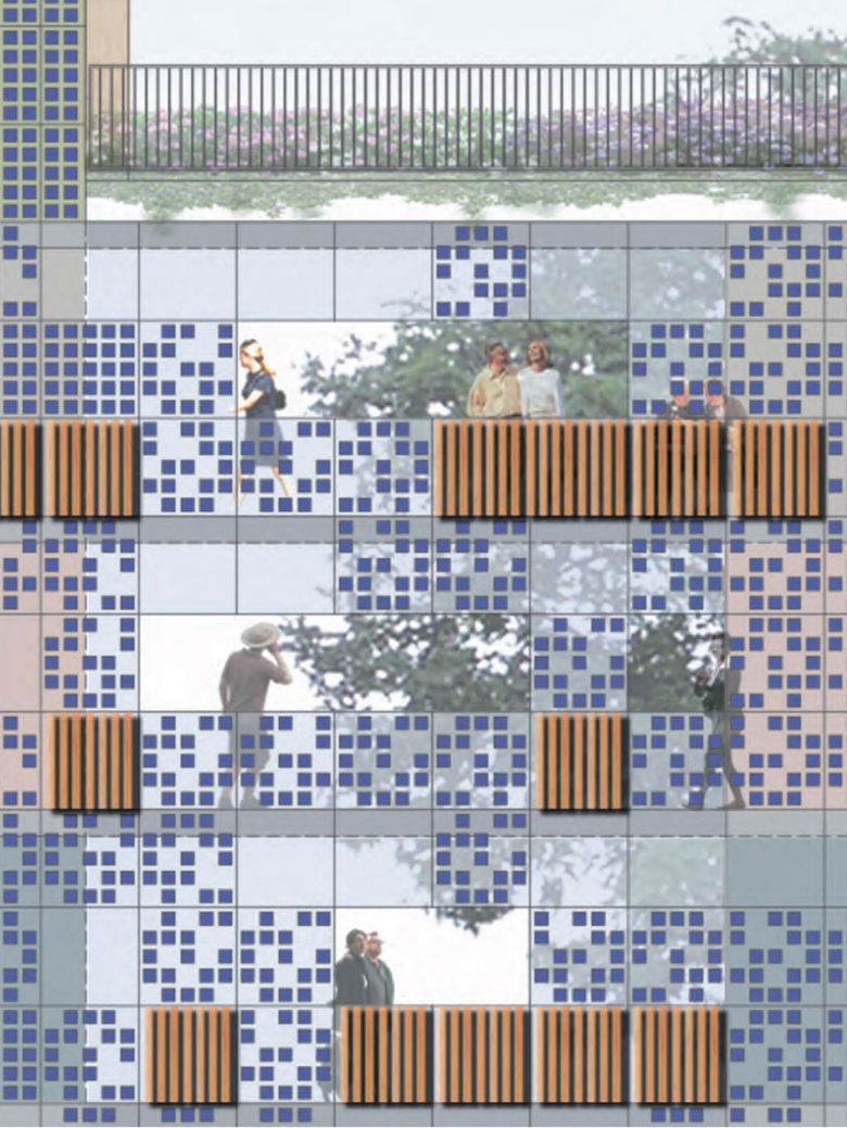 This project aims to create an urban connection by reconciling the quality of the neighbourhood’s urban environment and the hardness of the periphery boulevard infrastructure, converting the building into a structuring element in the city. How can this undertaking tackle the issue of the various urban scales as it aims to connect the city, on the edge of a car-traffic road featuring a long facade, a technical PV array wall and sound barrier?