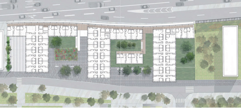 The International Residence project aims to foster cohesion between residents and the neighborhood population and enhance the value of the public space. Thus it seems appropriate to contextualise the project in its place and have it dialogue with its immediate environment and the city, so it becomes a relational building: moving from human to urban, proposing a lighthouse building in the metropolitan landscape. The backbone of the building-comb is a street-gateway on the south, on which are built buildings ranging from two to nine levels. This suspended street makes it possible to explore the central volumes in such a way that all rooms face north and south.