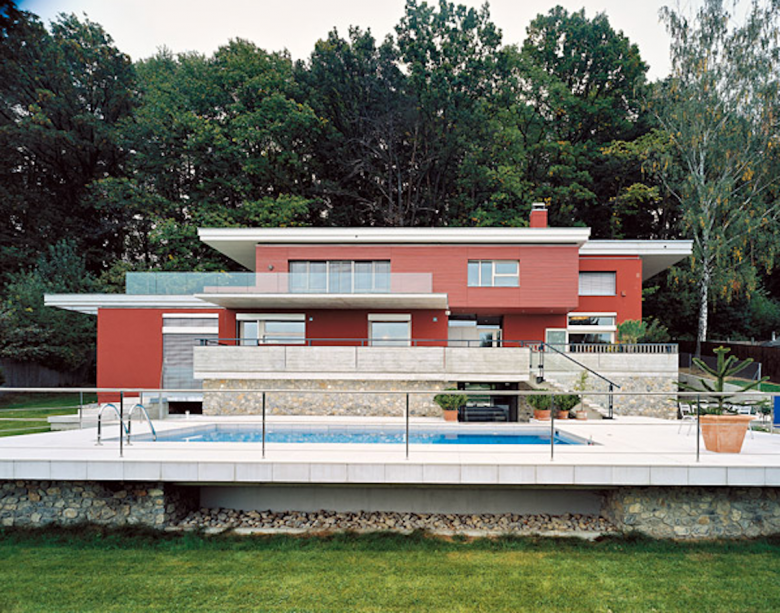 Die Formensprache ist ruhig und entwickelt sich aus den inneren Abläufen - teilweise offene Übergangsbereiche der Nutzungsfunktionen, Räume werden teilweise durch 2-geschossigkeit akzentuiert. (Halle, Wohnraum) Als wesentliches Funktionselement wird vor das Haus eine 'Platte' eingebettet. Sie nimmt in ihrem Inneren das Schwimmbad auf, leitet in den Fitnessbereich über und ist über Brücken mit dem Haus verbunden. Eine grosse Markise und der Teakholzboden unterstreichen im Sommer die schiffsartige Nutzung. Als Materialien werden aussen Putzflächen, Naturstein und Teakholz vorgeschlagen, im Inneren bestimmen Holzböden und klare Wandflächen das Erscheiningsbild.
