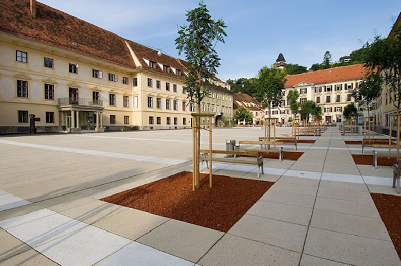 Die Gestaltung des Karmeliterplatzes erstreckt sich vom Aufgang zum Schlossberg, dem Schlossbergtor bis zum Eintritt in den Pfauengarten. Ausgangspunkt der Überlegungen war eine Analyse der Bewegungsströmen über den Platz. Über den gesamten Platz wird ein regelmäßiger Raster an Querstreifen gelegt, der in weiterer Folge dynamisch verstärkt wird. An den beiden Punkten der maximalen Bewegungsdichte im Osten wie im Westen des Platzes, werden diese Streifen verdichtet, also näher zusammengezogen und in Platzmitte erweitert. Der räumliche Eindruck des Benutzers bei einer Bewegung über den Karmeliterplatz erfährt so ein dynamisches Wechselspiel.