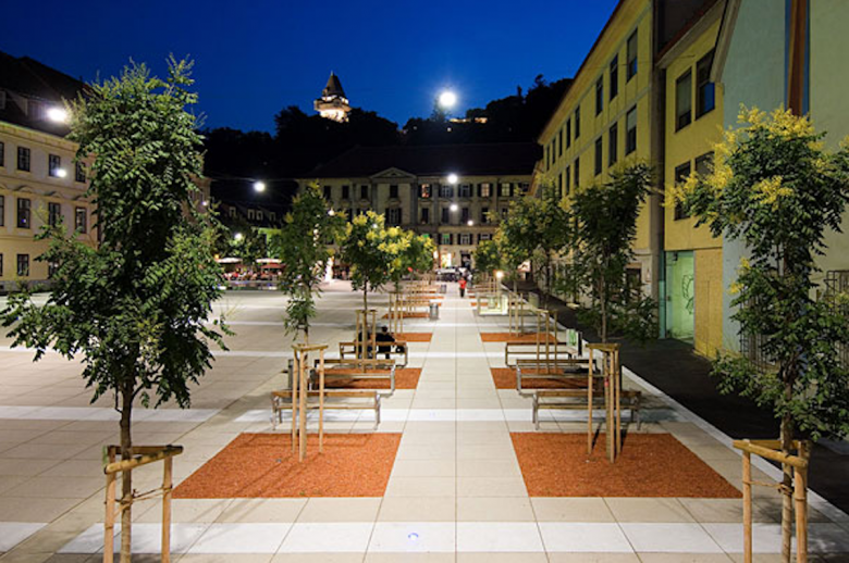 Für den Charakter des Platzes ebenfalls entscheidend ist die Unterbringung von Ruhezonen am Platz. Daher wurde an der nördlichen Grenze des Platzes eine Doppelbaumreihe positioniert, die dicht mit modernen Sitzmöbeln durchwoben ist.
