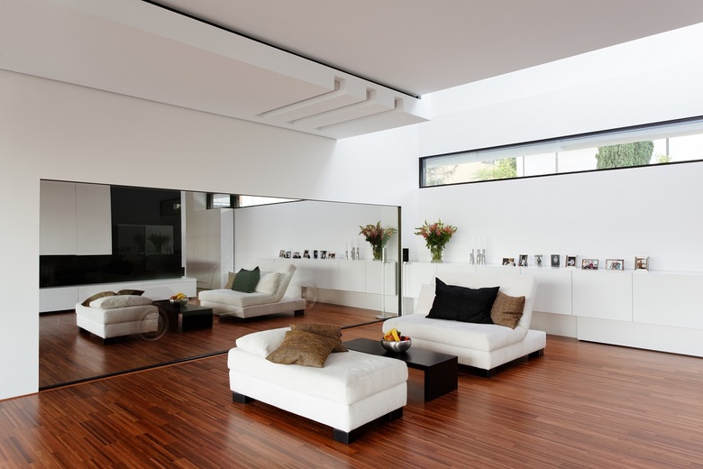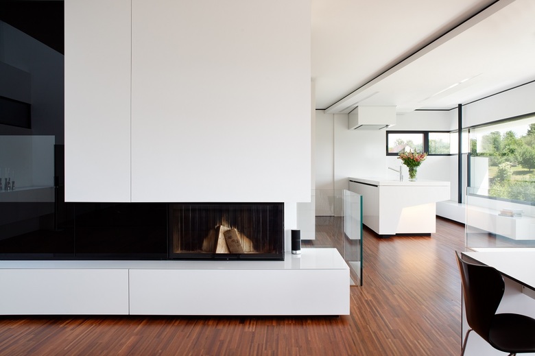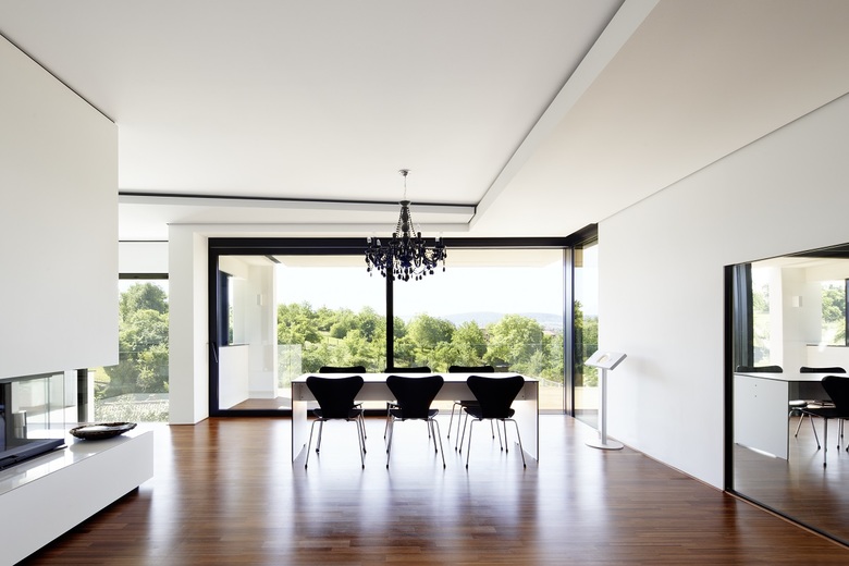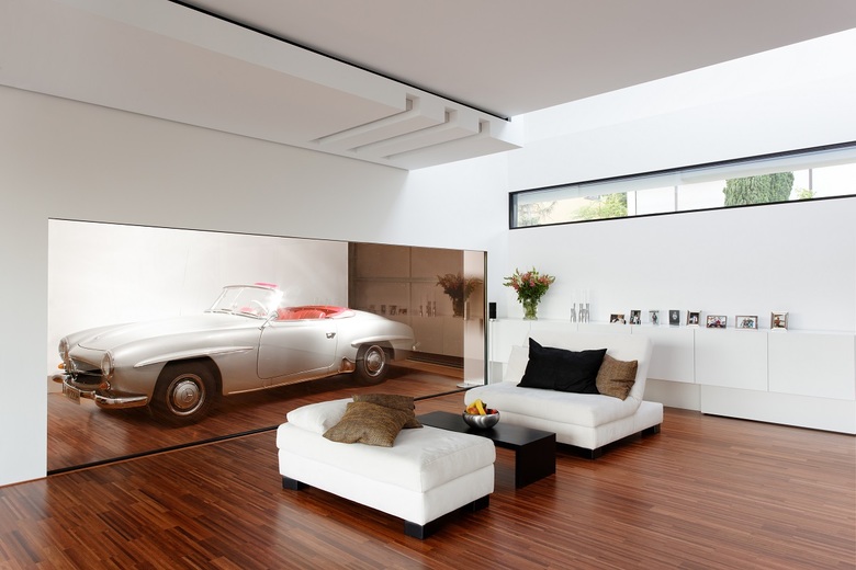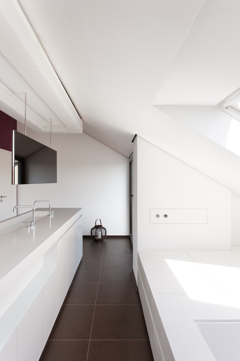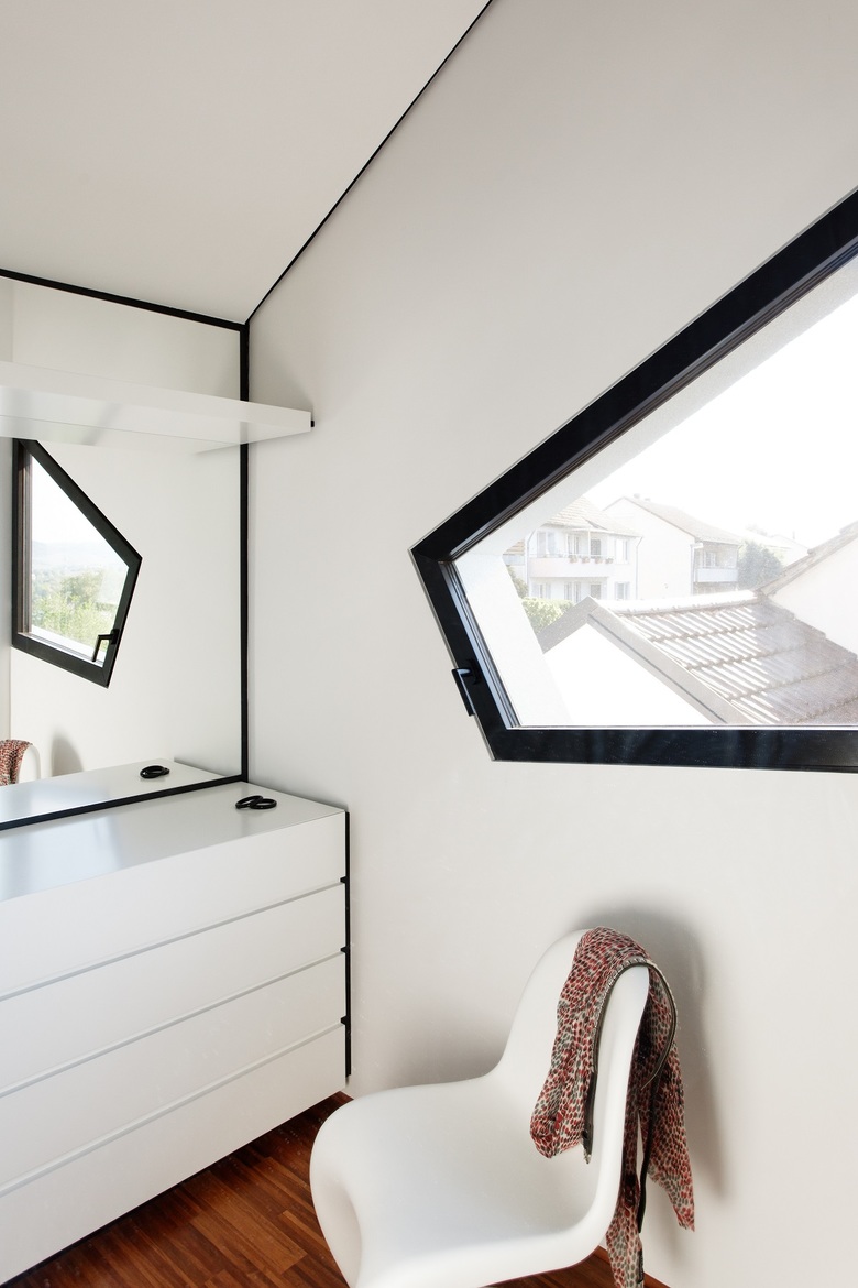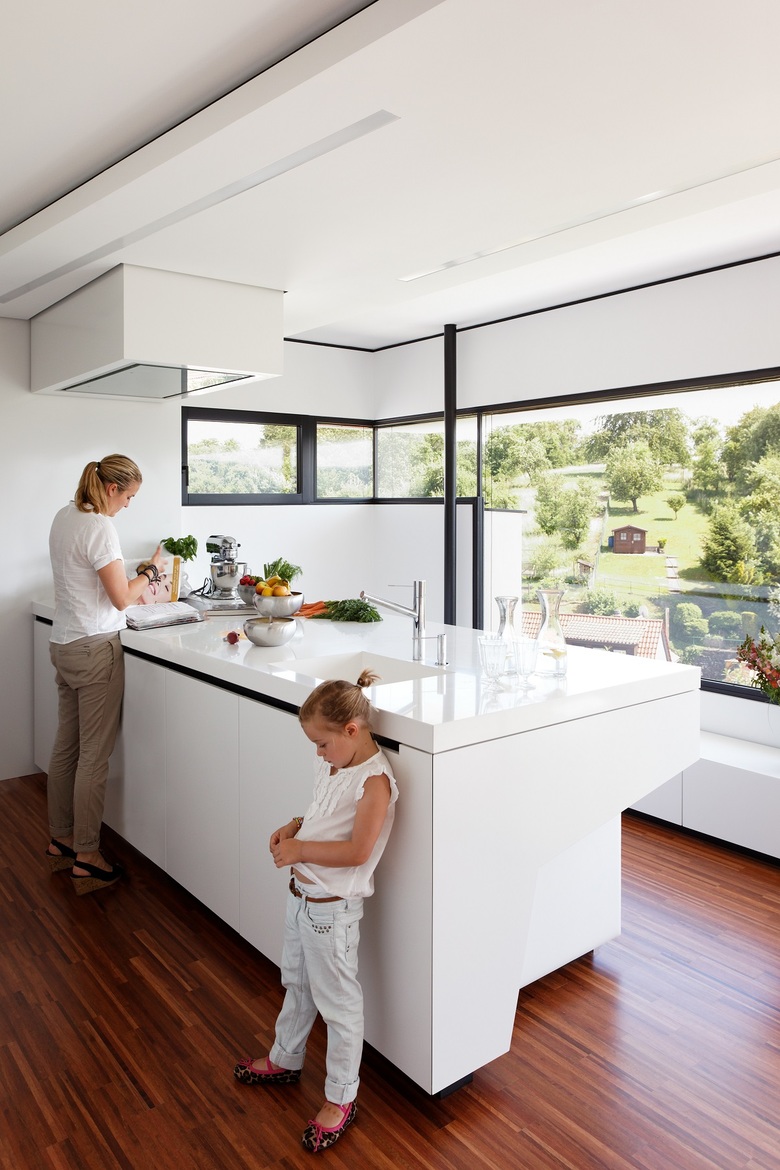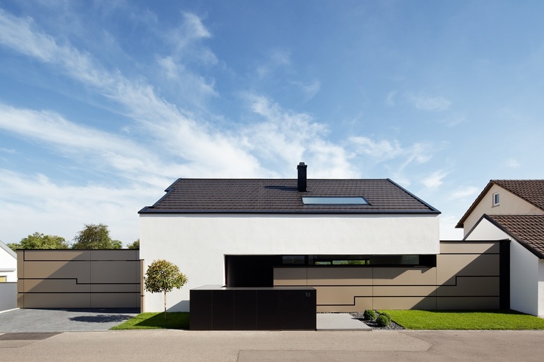 Erbaut in Waiblingen auf einem Hanggrundstück, das auf der Gartenseite durch die abfallende Kante eines ehemaligen Steinbruchs begrenzt wird, wurden für das Einfamilienhaus unterschiedliche Fassaden entwickelt. Während es zur Straßenseite sehr geschlossen gestaltet ist und nur zwei Geschosse zu sehen sind, wurde es auf der Rückseite über großflächige Fenster dreigeschossig zum Garten geöffnet. Das Dach ist in Anlehnung an die umgebene Bebauung als Satteldach ausgeführt. Schräge Fenstereinschnitte im Giebel führen zu einer Verfremdung des klassischen Typus. Durch Vor- und Rücksprünge in der Fassade wird der Baukörper stark plastisch gegliedert. Eine goldene Fassade aus Plattenmaterial, fasst hier Garagentore und Türen zusammen. Zum Garten hin werden durch die plastische Gestaltung überdachte Bereiche wie Terrassen und Balkone gebildet. Im Wohnzimmer entsteht durch den Luftraum zum Dachgeschoss sowie spezielle Materialien eine spannende Raumsituation. Hier wurde zur Oldtimergarage hin eine große Spionglasscheibe eingesetzt und die Möglichkeit geschaffen, das Auto je nach Wunsch mit Beleuchtung sichtbar zu schalten oder hinter dem großen Spiegel verschwinden zu lassen. Der Parkettboden im warmen Merbauton sowie die weiß lackierten Möbel bilden für diese Szenerie einen ruhigen Hintergrund. Alle Möbeleinbauten sowie die Küche wurden nach Entwürfen des Architekturbüros gefertigt und schaffen ein durchgängiges Gesamtbild in allen Geschossen.