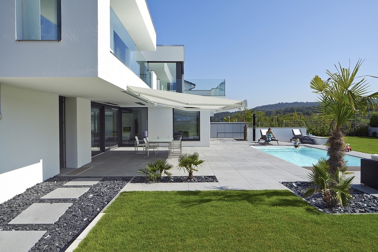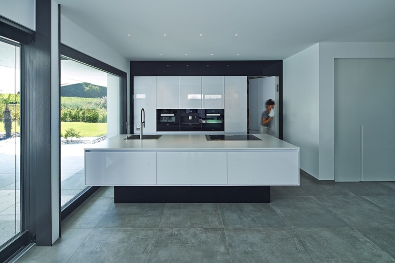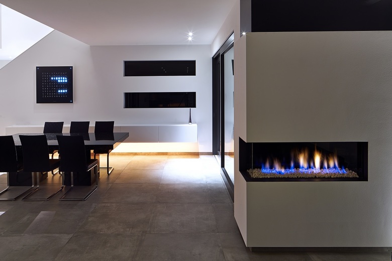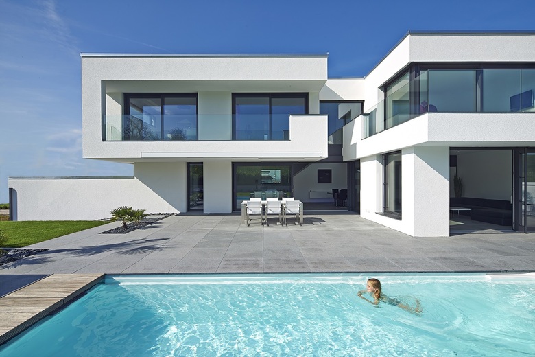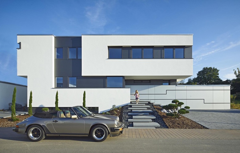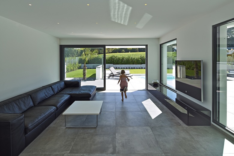 In ruhiger Umgebung angrenzend an ein Naturschutzgebiet steht die Villa Belice. Vor- und Rücksprünge in der Fassade sowie starke Kontraste in Farbgebung und Materialität prägen den Bau. Während die Hausseite zur Straße weitgehend geschlossen bleibt, um Einblicke auszuschließen, öffnet sich die Fassade über raumhohe Fenster und Glasschiebetüren zur Landschaft. Ein gestalterisches Element der Vorderseite der Villa ist die Verkleidung aus silbergrauem Plattenmaterial mit prägnanten schwarzen Fugen. Sie verbirgt Funktionen wie das Garagentor oder Briefkasten und fasst sie zu einer Einheit zusammen. Auf der Gartenseite schiebt sich der Balkon über die Terrasse im Erdgeschoss und bildet dadurch einen überdachten Essplatz mit Blick auf den Garten mit Pool und dem Naturschutzgebiet im Hintergrund. Das Wohnzimmer wurde zum Koch- und Essbereich leicht versetzt angeordnet, dadurch entstehen individuelle Zonen ohne den Raumfluss zu unterbrechen. Über dem Essbereich stellt ein Luftraum den Bezug zum oberen Geschoss her, in dem sich der Privatbereich der Bauherren befindet. Die geräumige Familiengarderobe agiert gleichzeitig als Schleuse zwischen Garage, Vorratsraum und Empfangsbereich. Verborgen in der homogenen Front des Küchenmöbels liegt die Tür zum Vorratsraum. Starke Kontraste zwischen weiss lackierten, hochglänzenden Oberflächen und schwarzem Glas nehmen das Thema der Außenfassade im Inneren wieder auf. Die Durchgängigkeit in Gestaltung und Farbe von Fassade, Innenarchitektur und Außenbereich sorgt für ein harmonisches Gesamtbild.