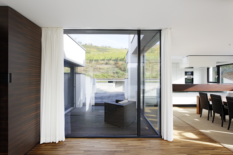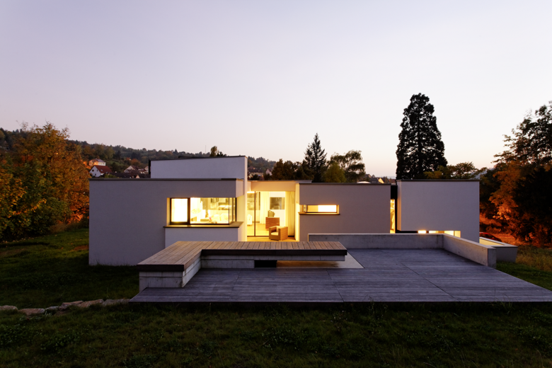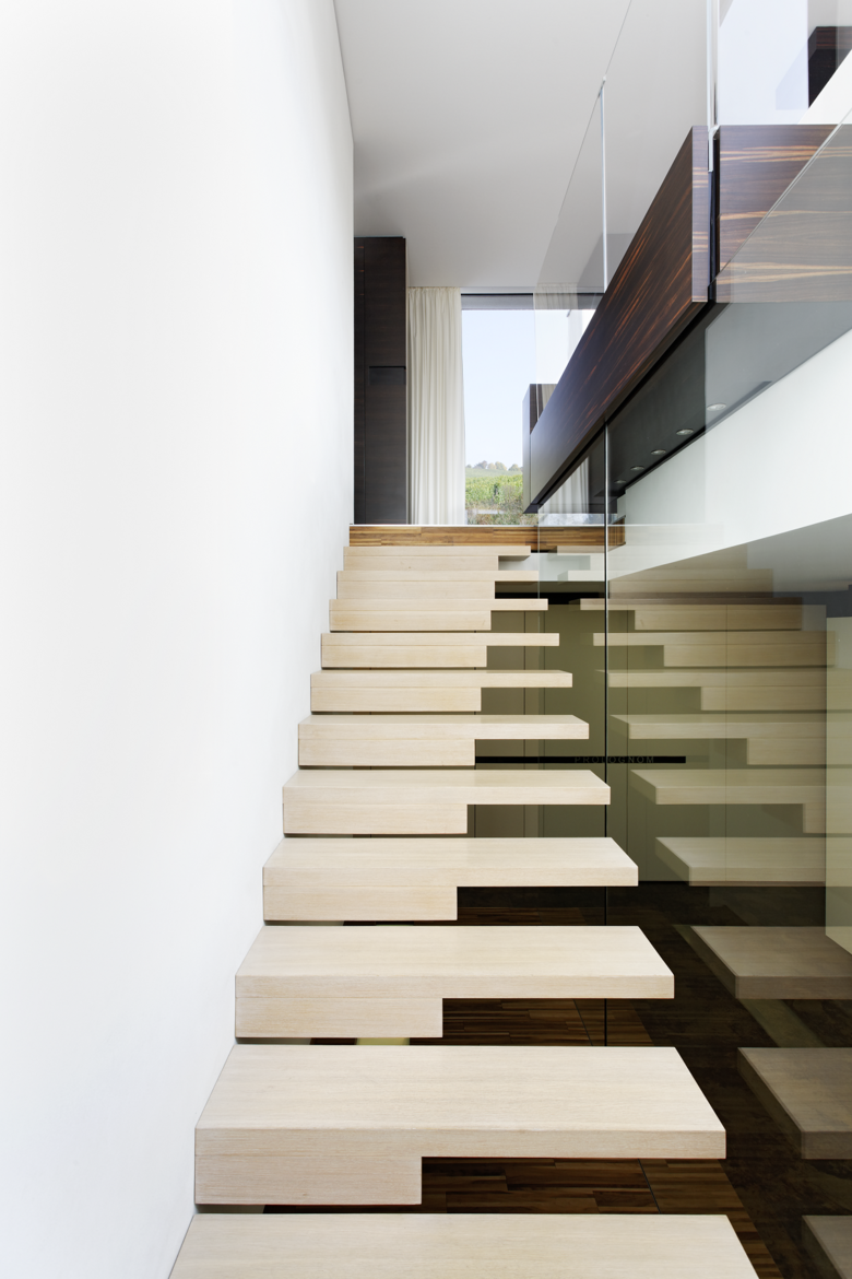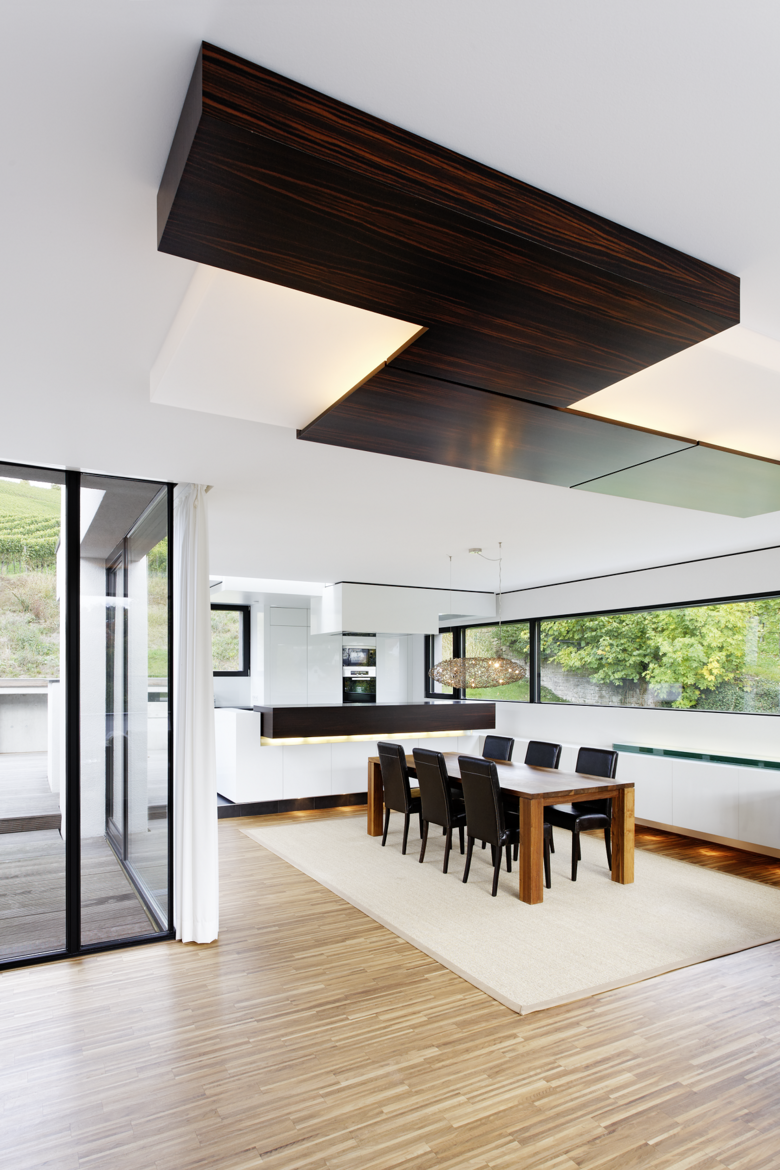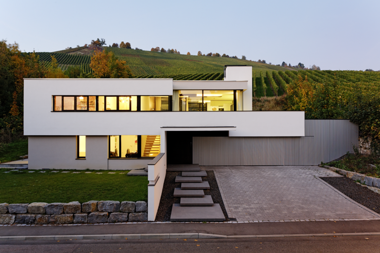 Direkt in den Weinbergen am Rande von Stuttgart gelegen, wurde die zweigeschossige, kubische Villa leicht in den flach abfallenden Hang geschoben. Von außen sind die beiden Geschosse durch Material- und Farbwechsel sowie Versprünge in den Ebenen klar voneinander getrennt. Im Inneren verteilen sich die Räume gemäß ihrer Funktionen über die beiden Stockwerke. Während im unteren neben den Kellerräumen und der Garage mehrere Arbeitszimmer, ein Wellnessbereich und eine Au-Pair-Wohnung untergebracht sind, beherbergt das obere Geschoss die Wohn- und Schlafräume der Familie. Erschlossen über große Trittplatten entlang einer Wandscheibe, öffnet sich der Eingangsbereich großzügig zur oberen Wohnebene, zu der frei auskragende Treppenstufen führen. Oben angekommen geben raumhohe Verglasungen im Wohn-Ess-Bereich den Blick frei auf die umliegenden Weinberge sowie die Stadt. Der Badbereich zeigt sich wesentlich geschlossener. Gezielte Einschnitte, wie ein horizontales Fenster über der Badewanne, ermöglichen den Blick in den Garten. Wohn- und Esszimmer werden durch Niveausprünge in Boden und Decke sowie maßgefertigte Möbeleinbauten gegliedert. Im Eingangsbereich wurde ein homogenes Raumbild erzeugt. So sind hier sowohl die Türen zu den Räumen im unteren Geschoss als auch die Garderobe in einer durchgehenden Verkleidung zusammengefasst. Diese wurde ebenso wie alle anderen Möbeleinbauten von dem Architekturbüro entworfen, wodurch ein durchgängiges Gesamtbild geschaffen werden konnte.
