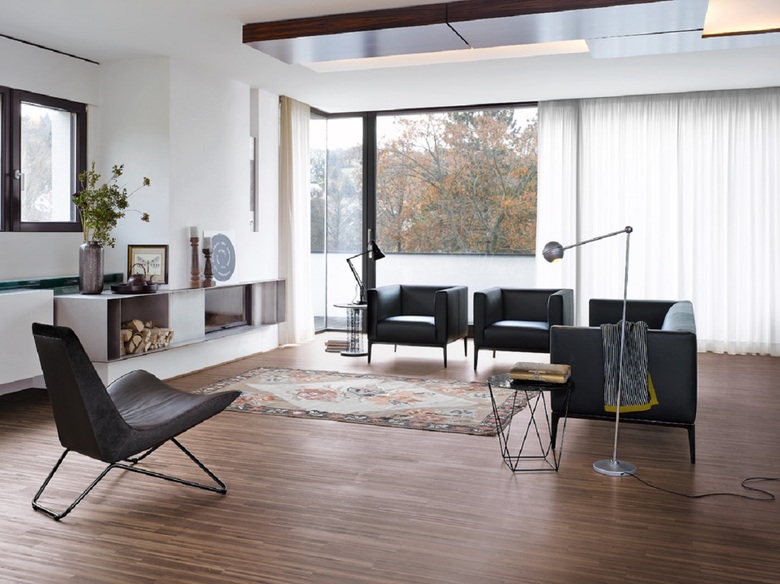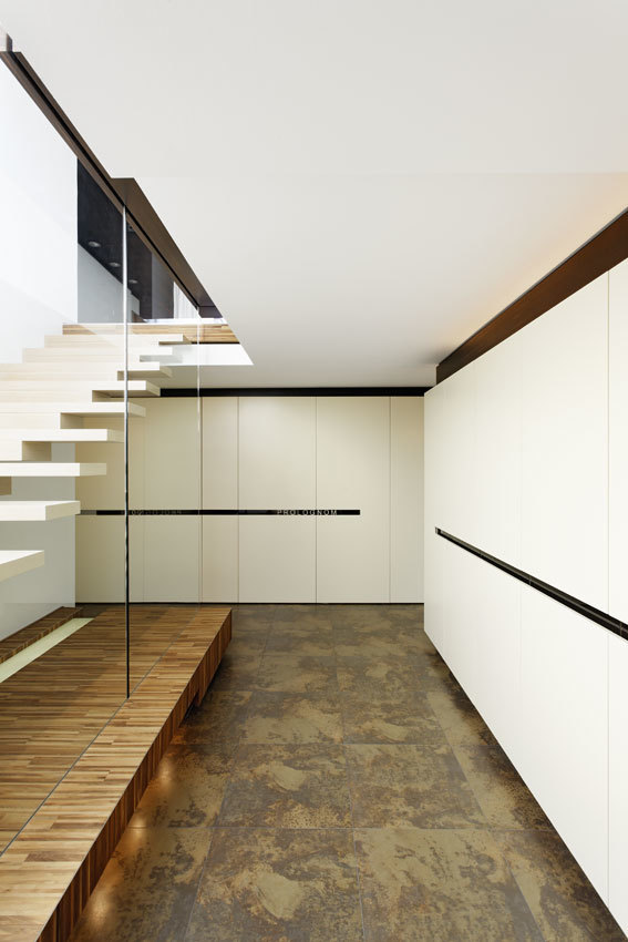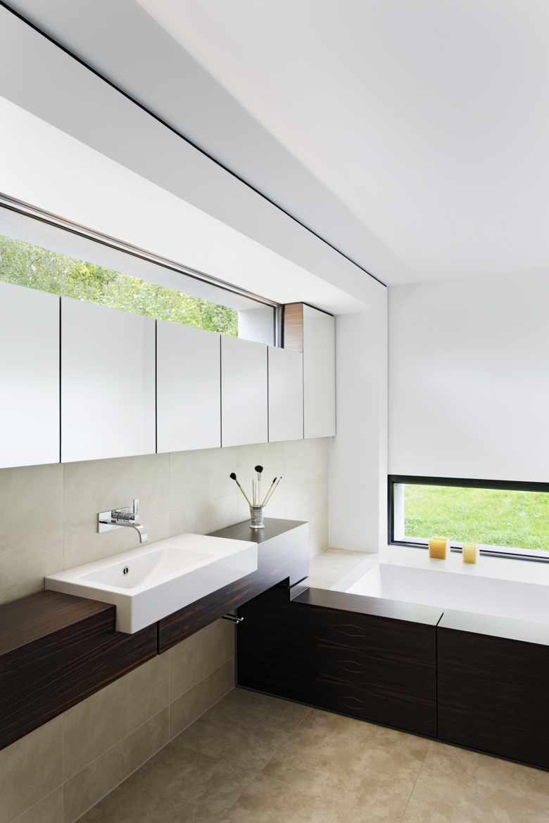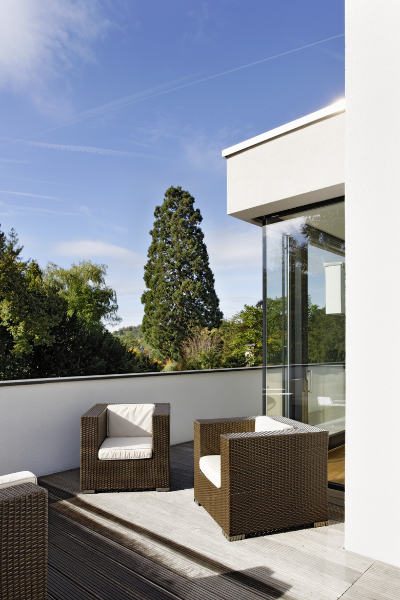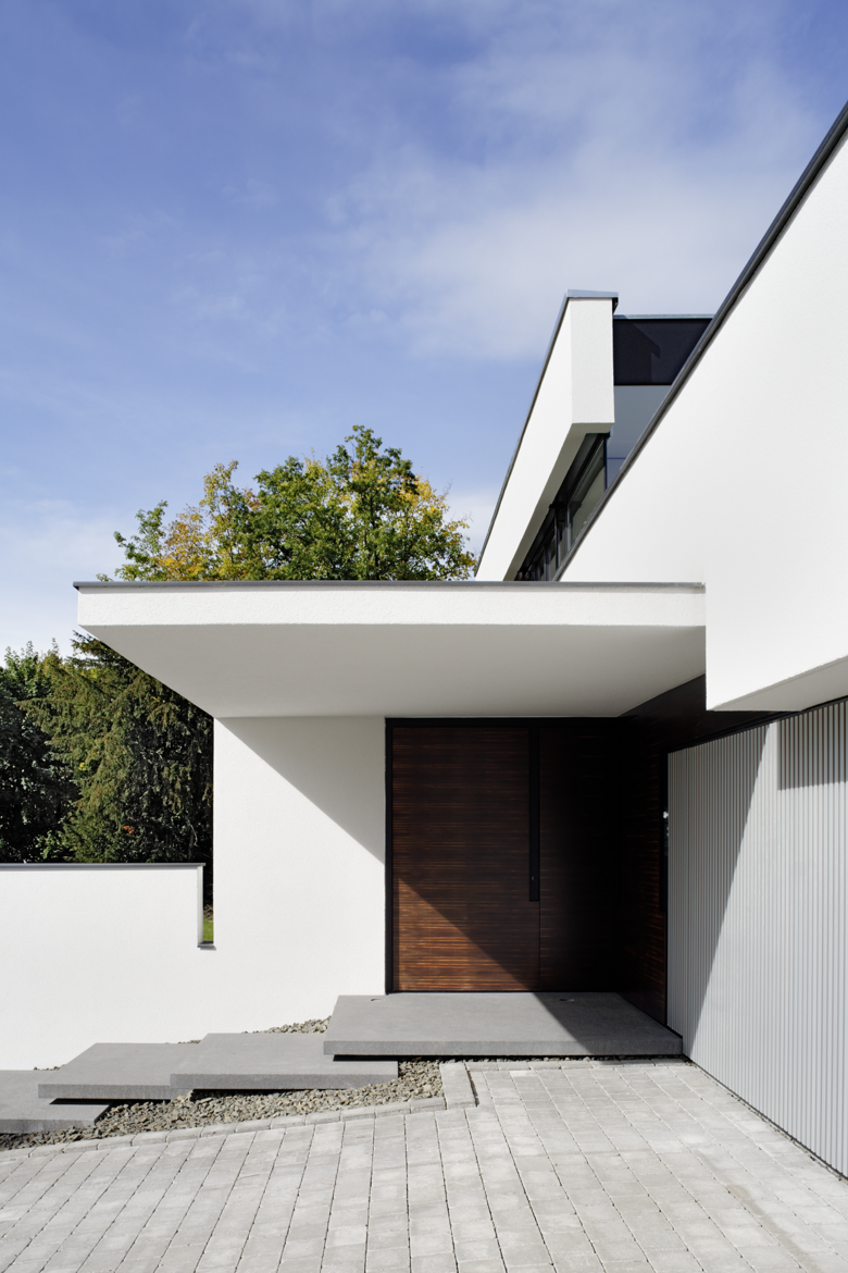 Direkt in den Weinbergen am Rande von Stuttgart gelegen, wurde die zweigeschossige, kubische Villa leicht in den flach abfallenden Hang geschoben. Von außen sind die beiden Geschosse durch Material- und Farbwechsel sowie Versprünge in den Ebenen klar voneinander getrennt. Im Inneren verteilen sich die Räume gemäß ihrer Funktionen über die beiden Stockwerke. Während im unteren neben den Kellerräumen und der Garage mehrere Arbeitszimmer, ein Wellnessbereich und eine Au-Pair-Wohnung untergebracht sind, beherbergt das obere Geschoss die Wohn- und Schlafräume der Familie. Erschlossen über große Trittplatten entlang einer Wandscheibe, öffnet sich der Eingangsbereich großzügig zur oberen Wohnebene, zu der frei auskragende Treppenstufen führen. Oben angekommen geben raumhohe Verglasungen im Wohn-Ess-Bereich den Blick frei auf die umliegenden Weinberge sowie die Stadt. Der Badbereich zeigt sich wesentlich geschlossener. Gezielte Einschnitte, wie ein horizontales Fenster über der Badewanne, ermöglichen den Blick in den Garten. Wohn- und Esszimmer werden durch Niveausprünge in Boden und Decke sowie maßgefertigte Möbeleinbauten gegliedert. Im Eingangsbereich wurde ein homogenes Raumbild erzeugt. So sind hier sowohl die Türen zu den Räumen im unteren Geschoss als auch die Garderobe in einer durchgehenden Verkleidung zusammengefasst. Diese wurde ebenso wie alle anderen Möbeleinbauten von dem Architekturbüro entworfen, wodurch ein durchgängiges Gesamtbild geschaffen werden konnte.