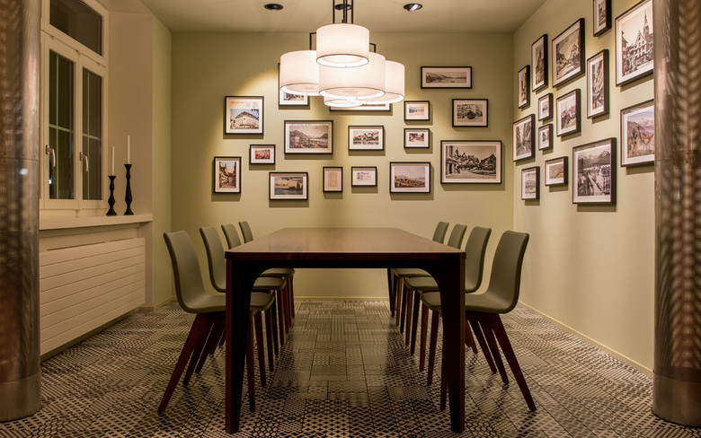 Im Separee finden sich die gemusterten Fliesen am Boden wieder. Darauf lädt ein massiver Nussbaumtisch zum Tafeln ein und eine Vielzahl von Bildern an der Wand erzählt von den alten Zeiten und der Tradition des Hauses. Angrenzend an das Separee bildet ein umfangreicher Weinschrank einen besonderen Blickfang.