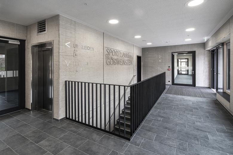 Der Ersatzneubau der Zweifeld-Mehrzweckhalle in Gößweinstein ist ein quadratischer Baukörper mit gestapelten Nebenräumen und Kopfbau mit Zugang zur Schule und Entree für Veranstaltungen. Die Stahlbetonkonstruktion zeigt sich im Inneren mit Sichtoberflächen in Bretterschalung wie auch in der Sockelfassade mit glatten Sichtoberflächen. Holzoptik kommt in Form von vorgegrauten Holzlamellen sowie im Dachtragwerk und der Prallwand im Inneren zur Anwendung. Der Komplex wird über ein Hackschnitzel-BHKW versorgt und die Halle über eine Zentrallüftungsanlage konditioniert.