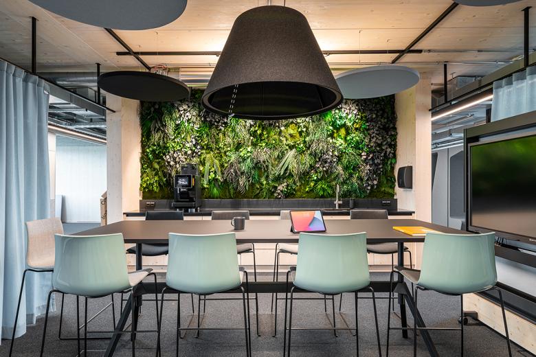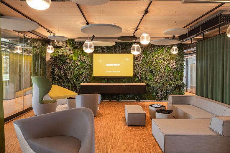 Auf dem Dach sind neben einem extensiven Gründach flächig eine Photovoltaikanlage aufgestellt, die die Stromerzeugung der Fassade unterstützt. Im Gebäudeinneren wurde die Technikführung bewusst gezeigt und nicht hinter abgehängten Decken versteckt. Unter Berücksichtigung aktueller Klimathemen kommt ein innovatives Heizsystem zum Einsatz. Kernbestandteil ist der Eisspeicher, der sowohl im Winter zur Wärmeenergieerzeugung als auch im Sommer zur Kühlung genutzt wird. Die Wärmequelle versorgt eine Wärmepumpe, die das Gebäude beheizt und kühlt. Die Wärme- und Kälteübertragung erfolgt über einen Klimabalken, der hauptsächlich über Konvektion die Räume beheizt oder kühlt. Als Beleuchtung kommen ausschließlich Lampen mit LED Technik zu Einsatz.
