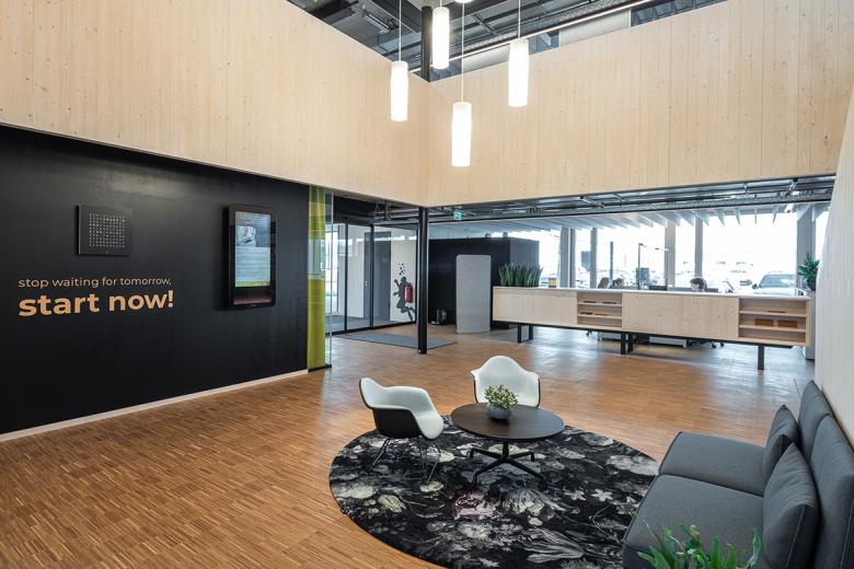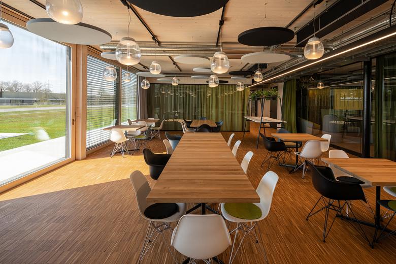 Das langgestreckte Gebäude wurde als ingenieursmäßiger Holzbau an der östlichen "Haustür" der Stadt Haßfurt entlang der B26 verwirklicht. Ein Tragwerk aus Holzstützen und Verbunddecken aus massiven Brettsperrholzplatten mit Betondeckung bilden Erdgeschoss mit zwei Obergeschossen aus. Der Großteil der Bauteilflächen bleibt holzsichtig. Durch unterschiedlich hohe Brüstungen wird die Horizontale betont und erhält zugleich eine gewisse Dynamik, passend zum Umfeld. Der offen gestaltete Grundriss orientiert sich mit den Büroflächen entlang der Fassade, welche die Räumlichkeiten mit einer umlaufenden großzügigen Verglasung ausreichend belichtet.