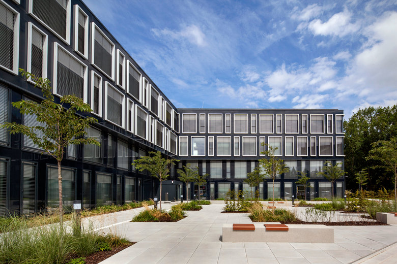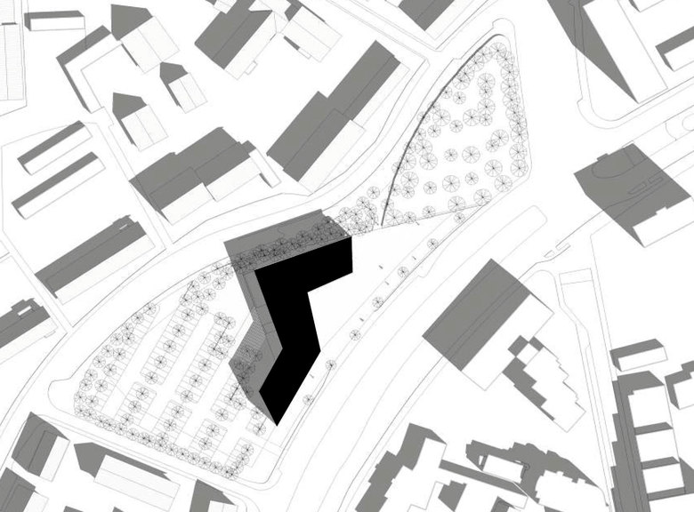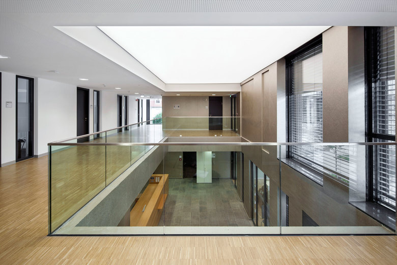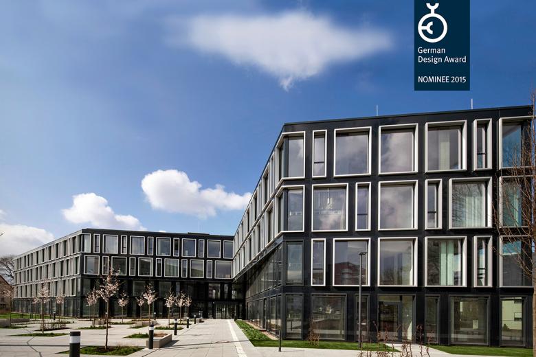 Korrespondierend zur Architektur nimmt die Gestaltung des Platzes Bezug auf die Formensprache des Gebäudes, die sich in der markanten Fassade abbildet. Dem prismatischen Baukörper haben die Architekten des Büros BAURCONSULT ein einheitliches Fassadenkonzept zugrunde gelegt, das auf einer modularen Grundordnung aufbaut. Dieses Grundkonzept erstreckt sich über alle Funktionen und die gesamte Fassadenabwicklung. Das Gebäudeinnere ist von einer zellenartigen Raumstruktur geprägt, die sich ihrerseits an der Außenfassade spiegelt. Jeder „Grundzelle“ sind eine Fensterverglasung und ein schlanker Lüftungsflügel zugeordnet und entsprechen jeweils der Höhe der Räume. Diese Anordnung leitet das Grundthema der Fassadeneinteilung in einem Verhältnis von 2 zu 1 ein.