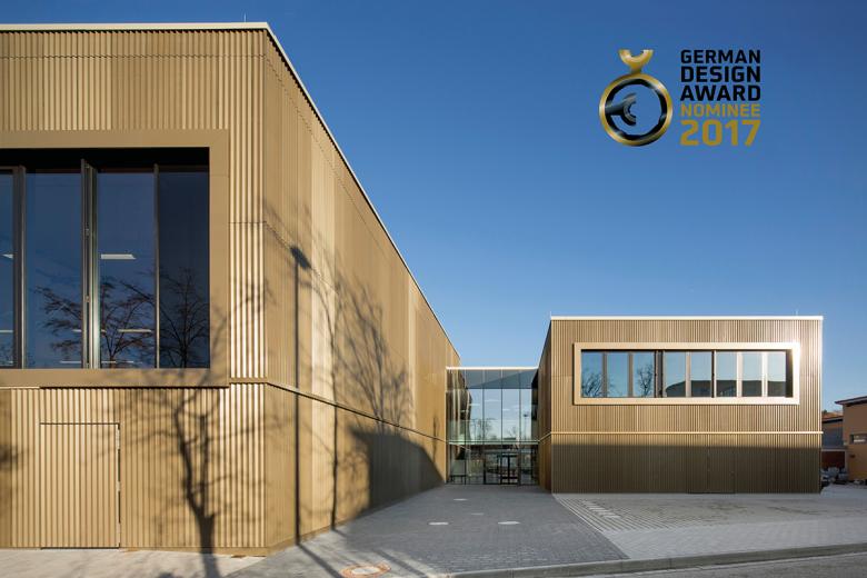 Der dreiteilige Grundriss bildet die unterschiedlichen Funktionsbereiche des neuen Gebäudes ab. Das angemessen großzügige Foyer dient als Zwischenglied und Vermittler. Von der rückseitigen Magistrale dient es als Haupterschließung von den Schulen. Zugleich öffnet es sich mit dezenter, aber eindeutiger Geste zur Straße und dient als (Neben-)Eingang für (abendliche) Veranstaltungen. Die Funktionszone der Turnhalle ist zweigeschossig und dient ganz dem Gedanken einer raumökonomischen und reibungslosen Erschließung. Der großzügig verglaste Speisesaal wird über das Foyer erschlossen und erhält einen überdeckten, zugeordneten Außenbereich zum Vorplatz der Realschule. Die gegeneinander versetzten Pultdächer reagieren auf die vorhandene, reich gegliederte Dachlandschaft des bestehenden Schulkomplexes. Durch den Versatz in den Dächern wird die Turnhalle über das Lichtband zusätzlich seitlich blendfrei von oben belichtet. Der Dreiklang aus Beton, Glas und Metall gibt dem Gebäude eine angemessen zeitgenössische Note, entspricht aber auch dem vorstädtisch-ländlichen Charakter des Ortes, der insbesondere für großvolumetrische Gebäude in der Vergangenheit oft verwendet wurde. Weitgehend durch dieses Material wird die Anmutung der Fassade geprägt, die sich mäandrierend um den maßstäblich gegliederten Baukörper legt.