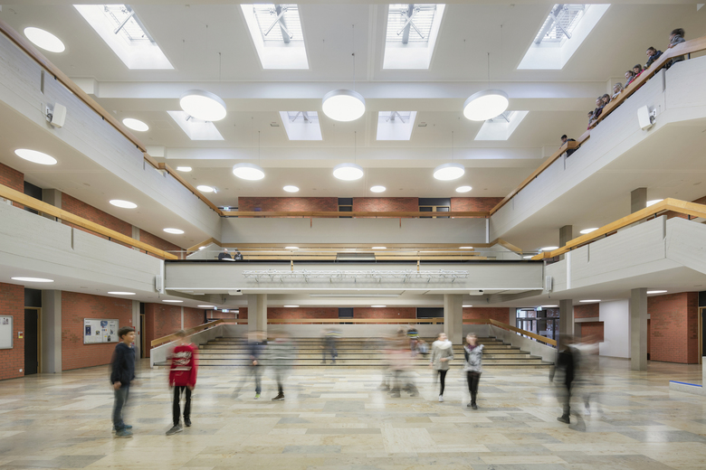 Die Realschule Forchheim gilt als typisches Beispiel für Schulbauten Anfang der 70er Jahre mit Sichtbeton sowie einer ansprechenden Natursteinverkleidung. Bei der energetischen Sanierung lag die Herausforderung darin, die unter Urheberrecht des Architekten stehende Fassade energetisch zu ertüchtigen und gleichzeitig die gebäudespezifischen Eigenheiten zu wahren. Um die Schule auf heutigen Energetischen Standard zu bringen, wurde die gesamte Fassade mit einer diffusionsoffenen Innendämmung versehen. Wie bei fast allen Bauten dieses Typs entsprach der Brandschutz nicht mehr den heutigen Anforderungen. Hauptaugenmerk lag dabei auf der Sicherung der Fluchtwegsituation in der über drei Geschosse offenen Aula. Das bisherige Lichthofareal wurde zur Schaffung weiterer Schulräume genutzt: In den vorhandenen freien, aber überdachten Innenbereich wurden zwei Geschossdecken eingezogen. Eine komplett erneuerte Sanitäranlage, der Neuaufbau der Wärmeverteilung sowie die Aufrüstung der grundlegenden Elektrotechnik bringen die Georg-Hartmann-Realschule auf das Level einer modernen und gut ausgestatteten Schule, die ihren Schülern nun beste Lernbedingungen bietet.