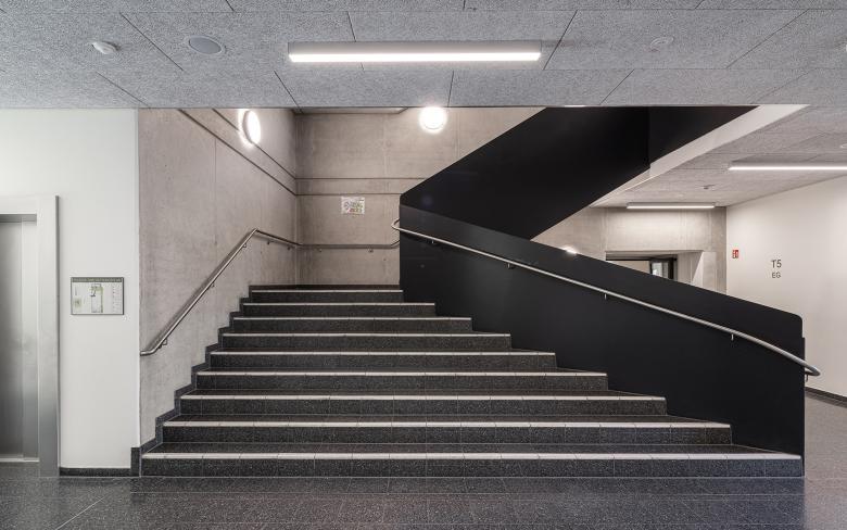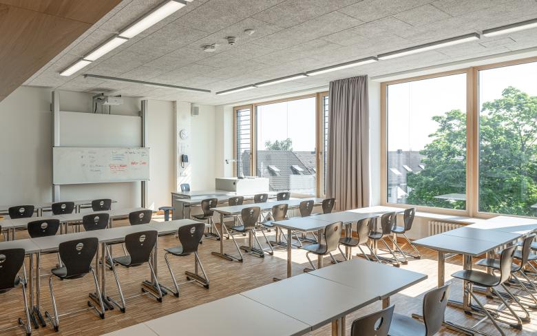 Zusätzlich wurde die Erweiterung durch interaktive Komponenten, eine effiziente Anlagentechnik und eine hybride Lüftung der Klassengeschosse sowie des Versammlungsraums ergänzt. So fügt sich das moderne, zeitgemäße Schulgebäude nahtlos in das bestehende Ensemble ein.