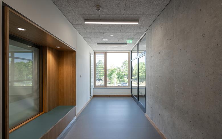 Der 4-geschossige Erweiterungsbau greift innere wie äußere Fluchten auf und setzt die Logik des Bestandes als Zweibund fort. Durch das Herausrücken zur Straße erhält das Gebäude zudem eine eigenständige Präsenz. Die Fassade wurde an die Klinkerfassade des Bestandsgebäudes angelehnt und durch wechselnde Verbände behutsam weiterentwickelt. Innen wurde mit nachhaltigen Materialien ein moderner Kontrapunkt gesetzt.
