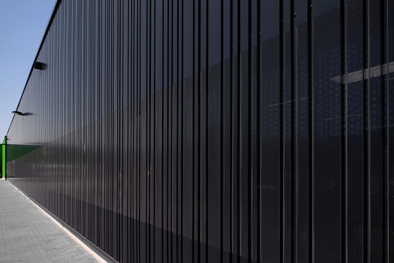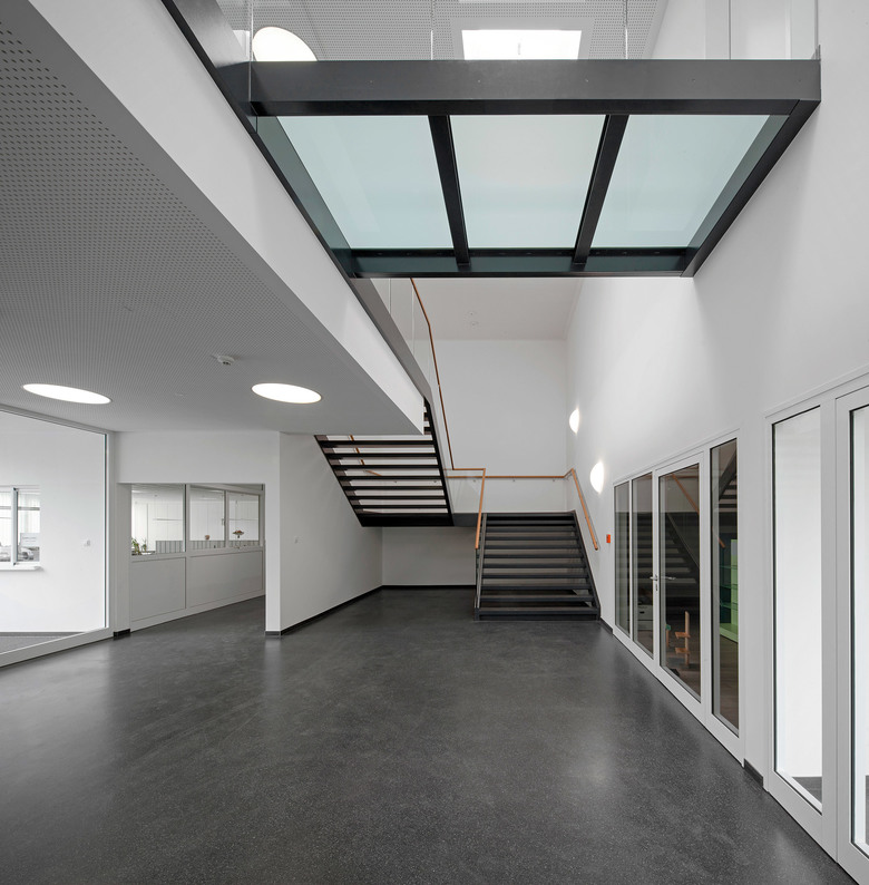 Die Fensterflächen werden dabei großflächig durch gelochte Blechtafeln überspielt, dadurch wird den Mitarbeitern ein von äußeren Blicken geschütztes, konzentriertes Arbeiten ermöglicht bei gleichzeitiger großer Transparenz von innen nach außen.