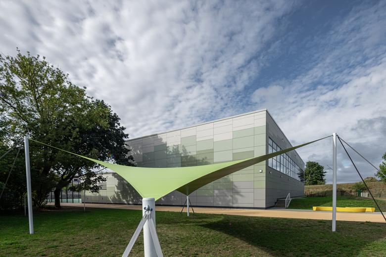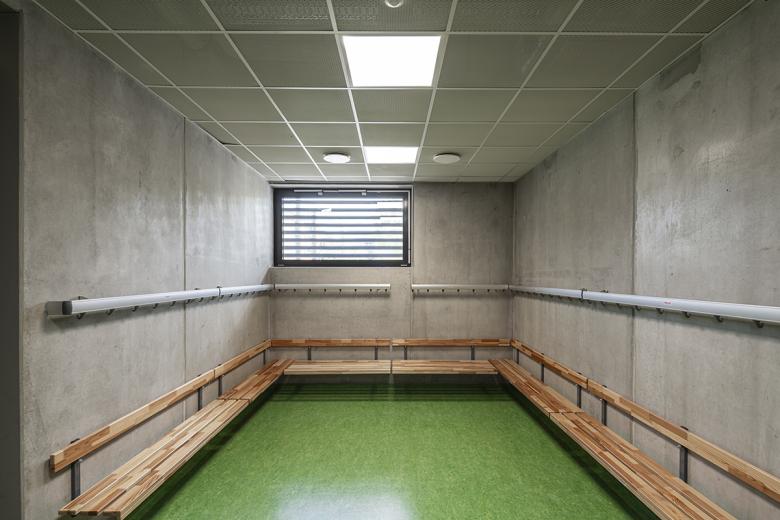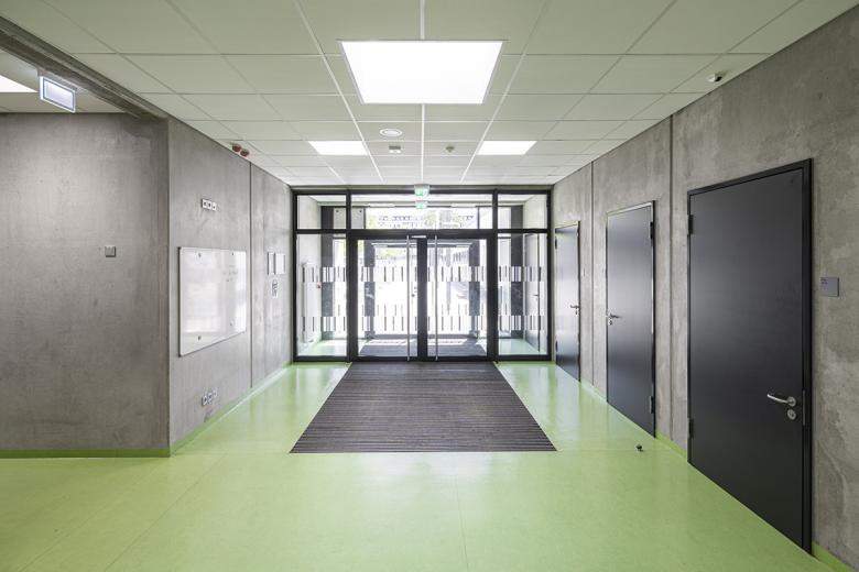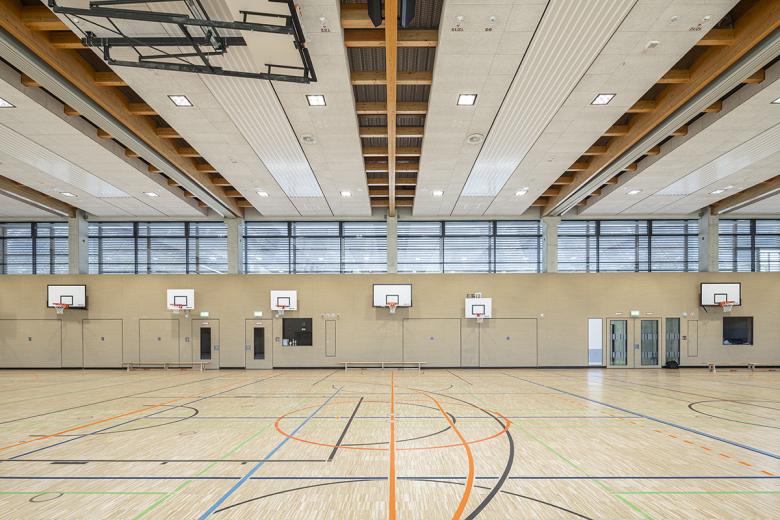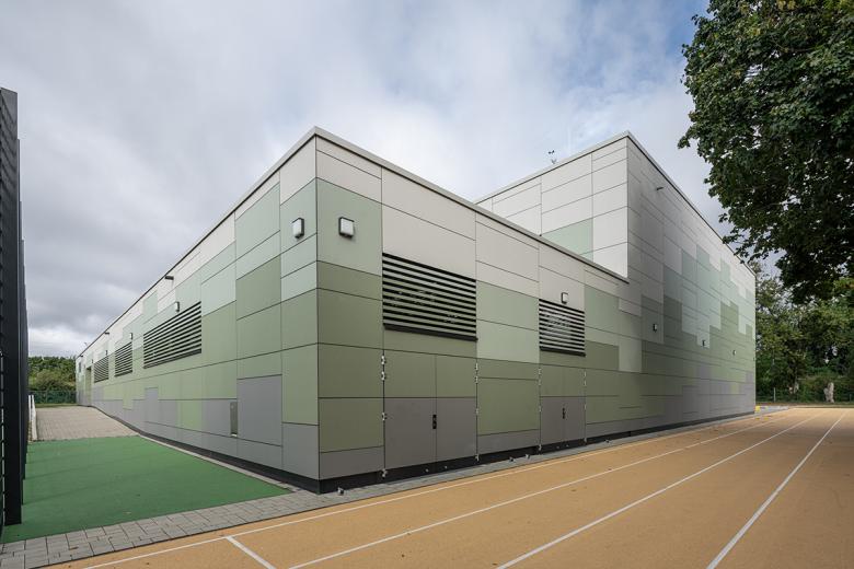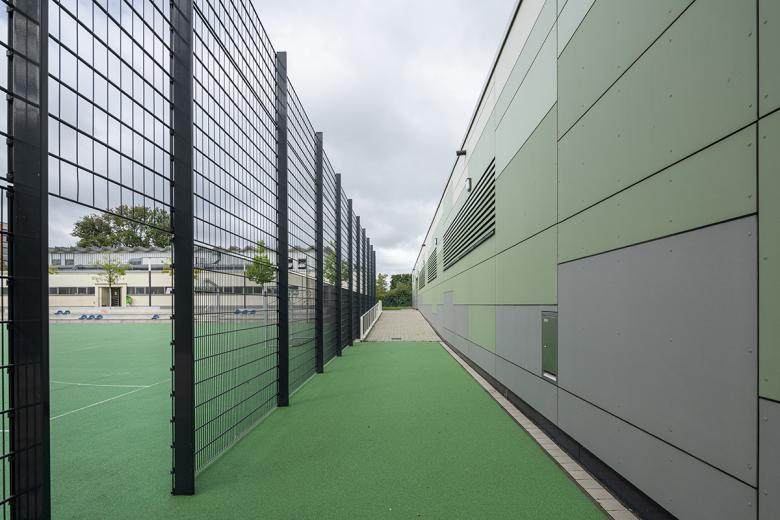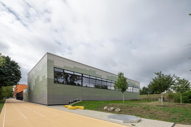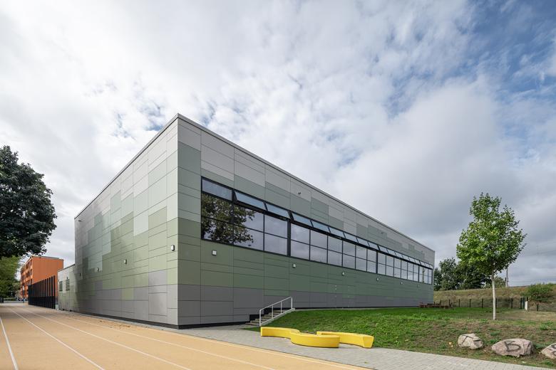 Am Schulstandort in der Haeckelstraße in Potsdam West teilen sich bisher die Zeppelin-Grundschule und das Hannah-Arendt-Gymnasium die bestehende, sanierte Einfeldhalle. Das Baufeld auf dem Grundstück, zwischen bestehender Halle, Plattenbau-Wohngebiet und Bahndamm, soll die neue Zweifeldhalle, eine 100m-Laufbahn und eine Kugelstoßanlage aufnehmen. Nach einer Standortanalyse mit Variantenvorstellung stand fest, dass die durch das Baufeld verlaufende Fernwärmetrasse verlegt werden muss. Die neue Halle wird nördlich der bestehenden Bebauung angeordnet, so dass sich im Ensemble mit dem Bestand und dem zu errichtenden Hartplatz eine stimmige Hofabfolge ausbildet. Die entstehende Erschließungsachse entlang der Bestandshalle führt direkt ins Foyer des Neubaus. Die Umkleiden sind barrierefrei und rollstuhltauglich geplant, die Halle wird gemäß der Nutzeranforderung dreiteilbar ausgeführt, für die nutzenden Vereine wird ein eigener Geräteraum vorgesehen. Die robuste Optik der geplanten Sichtbeton-Fertigteilbauweise wird durch die farbige Boden- und Wandgestaltung befreit. Die Fassade wird mit Faserzementplatten in einem dezenten Farbspiel von Grün- und Erdtönen verkleidet, der Sonnenschutz im Süden mit Lamellen aus Faserzement ausgeführt.
