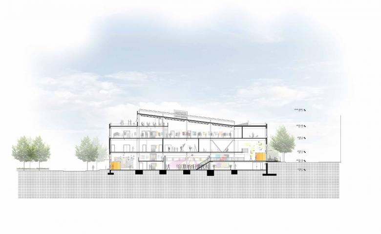 Artists for Humanity (AFH) is a non-profit organization that bridges economic, ethnic, and social divisions by providing under-resourced youth with the keys to self-sufficiency through paid employment in art and design. In 2014 AFH commissioned Behnisch Architekten to design a 30,000 gross sq.ft. addition to their existing EpiCenter facility in the rapidly evolving South Boston neighborhood. The new multi-story addition increases AFH’s overall footprint to 53,000 gross sq.ft. In addition, it allows to accommodate more youth artists, expanded galleries, expanded event space, and new studios, while doubling their employment of Boston teens in paid apprenticeships in visual arts and creative industries from 250 to over 500 annually.