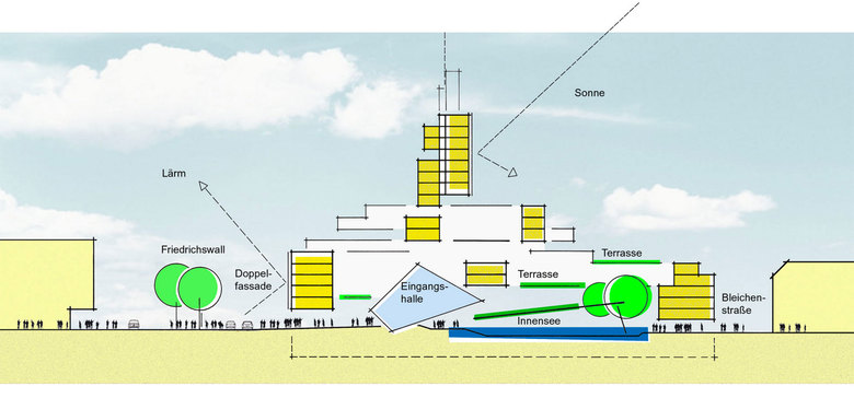 A vast proportion of the building is naturally ventilated. The interior is characterized by design decisions related to the progressive energy concept; superstructure is exposed and windows provide ventilation. Areas of ‘double facade’ provide protection against noise and vehicle emissions, whilst also serving as a duct transferring clean air from the central courtyard to the individual offices. The large areas of water in the courtyard increase the reflection of daylight and contribute towards a beneficial microclimate. Generous roof gardens not only soften the appearance of the building, they also act to improve the general climate for the occupants, and to collect rainwater for irrigation and use within the building.