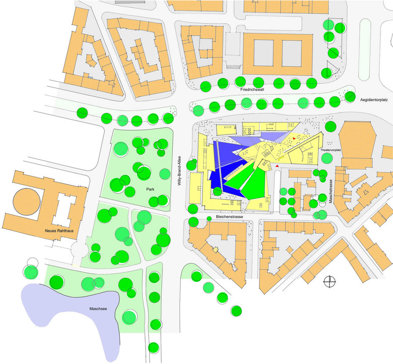 The expressive form of the tower refers neither to the styles of the immediate surroundings, nor to the orthogonal grid of the post-war city; instead it is a response to the historical downtown geometries to the north.
