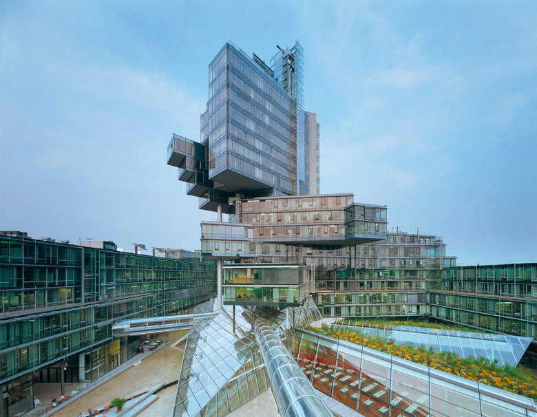 A distinctive, seventy-meter-high building rises from the courtyard, detaching itself through a series of twists and turns from the formal order of the lower, perimeter building, which establishes formal and visual links to the city beyond.