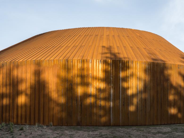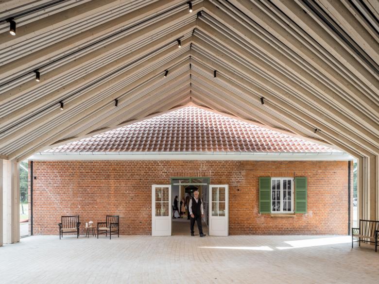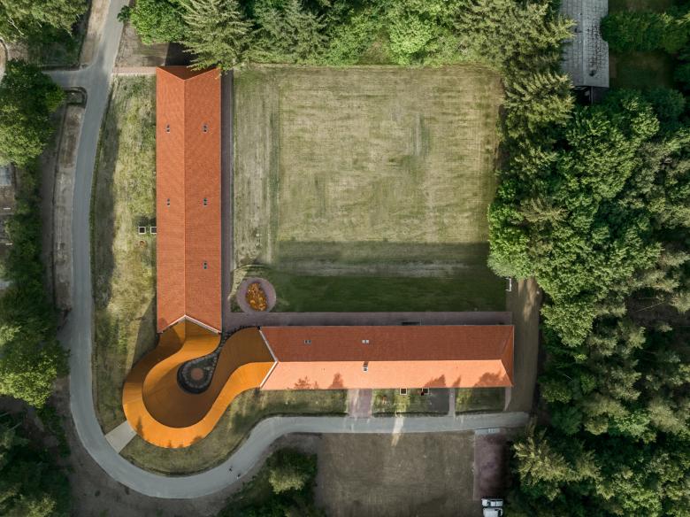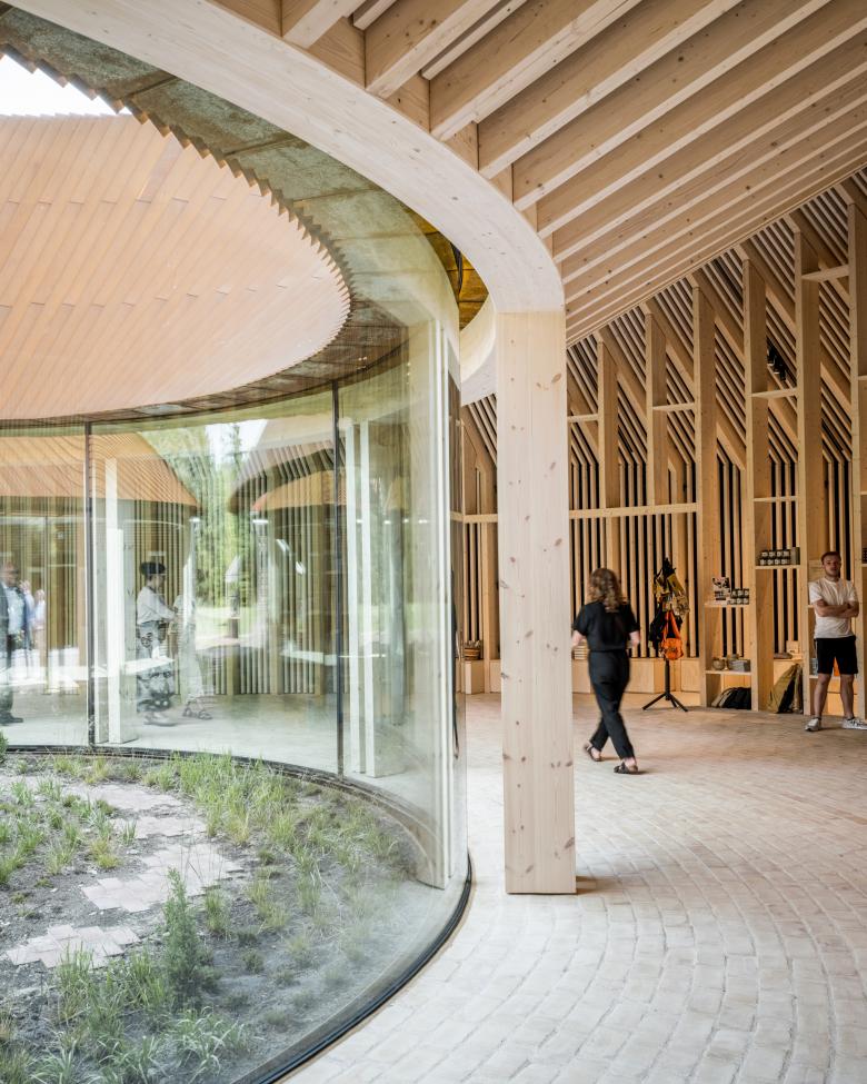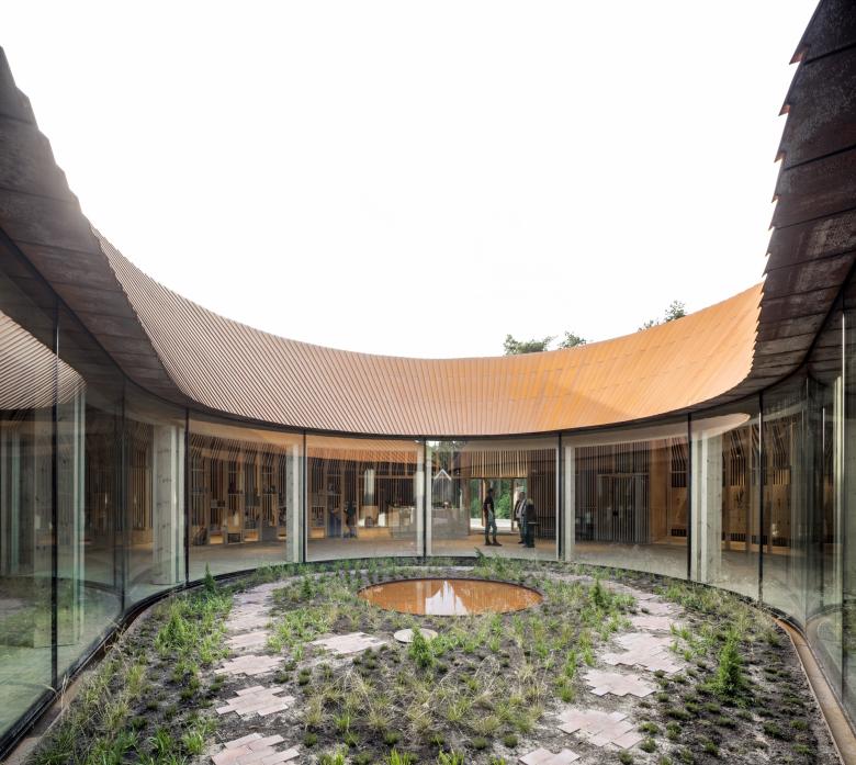 The curve is gently pulled towards the street to create an inviting arrival moment for the museum visitors. Clad in Corten steel, the structure feels at home along the red bricks of the former hospital buildings. From outside, the abstract volume welcomes visitors into what appears to be a closed entry hall. Upon entering, a floor-to-ceiling curved glass wall reveals a view of a sheltered green courtyard and the forest, where the refugee camp used to be. The courtyard lets light flow into the entry hall that functions as a lobby or a temporary exhibition space for guests to experience before continuing their journey into one of the museum wings.
