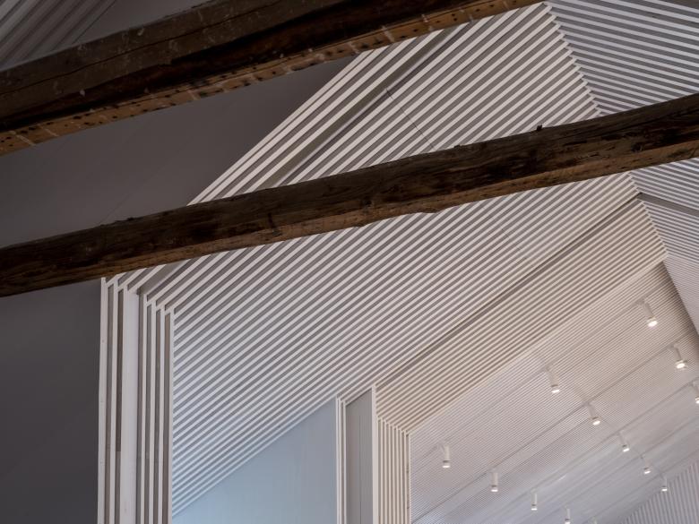 The exhibition area in the north wing contains gallery spaces organized according to the original flow/circulation in the hospital. While most of the hospital room walls were torn down, some of the inside walls are kept intact and stabilized by three cross sections, creating larger exhibition spaces. The south wing features a flexible conference room, smaller exhibition spaces, cafe, and back of house functions with the same character and materiality as in the north wing: white walls and intersections covered in white painted wood boards oriented according to the angle ceiling line, as well as yellow bricks across the entire museum floor, connecting past and present structures.