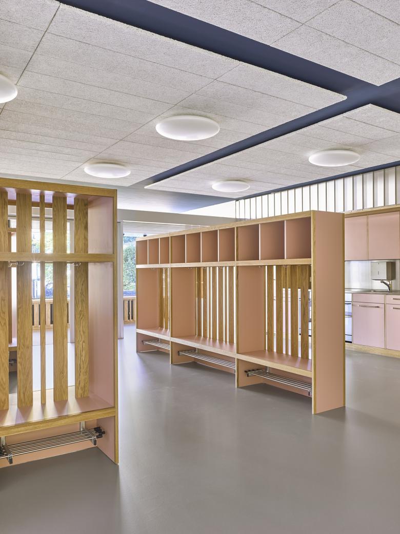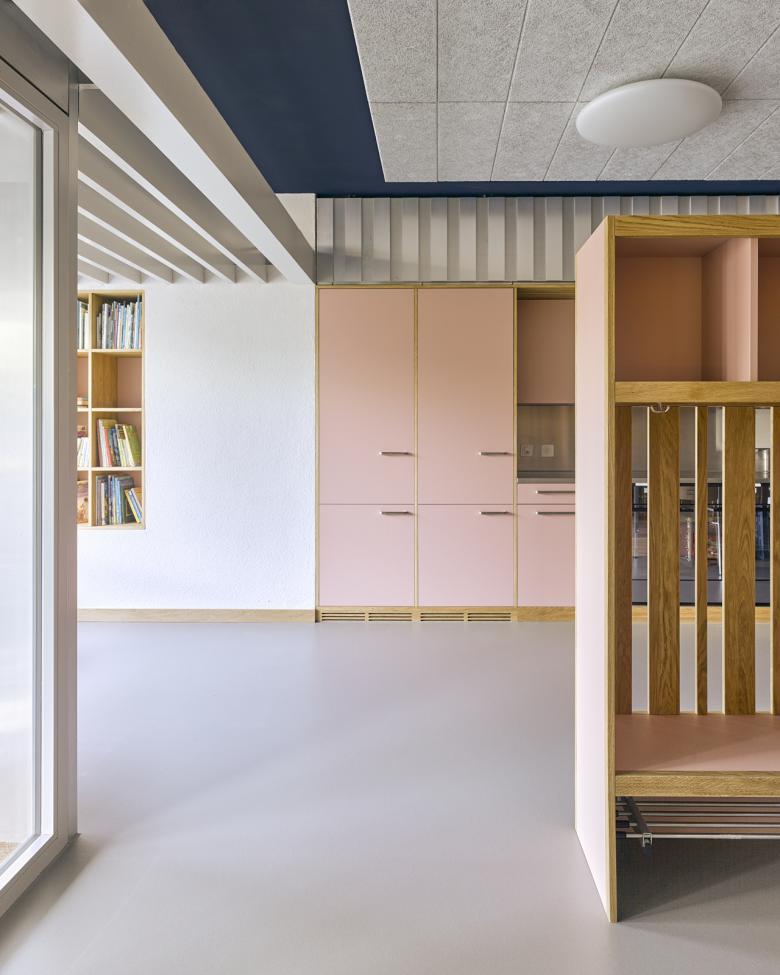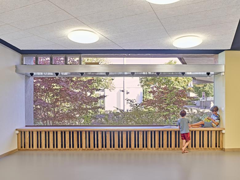 Der Hauptraum mit seiner ursprünglichen Grundrissform sowie die bestehenden grossen Fensterflächen konnten erhalten werden. Zusammen mit einem neuen Sims bilden sie kleine Lese- und Spielnischen. Die freistehenden Garderobenmöbel zonieren die grosse Raumfläche und schaffen einen Arbeitsbereich entlang der Küchenzeile, die zusammen mit Einbauschränken und einem Reduit in die innen liegende Längswand integriert ist. Die Zahnputzstation und die WCs befinden sich im dahinter liegenden Bereich. Im Rahmen des Umbaus wurde zudem eine neue Raumlüftung eingebaut und die Betondecke brandschutzertüchtigt.