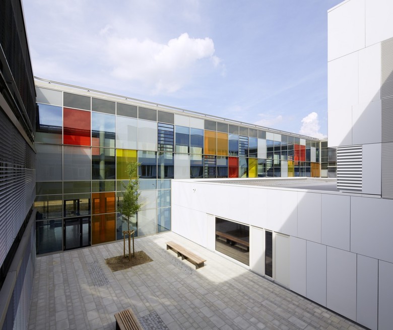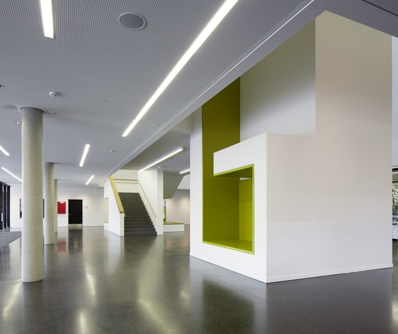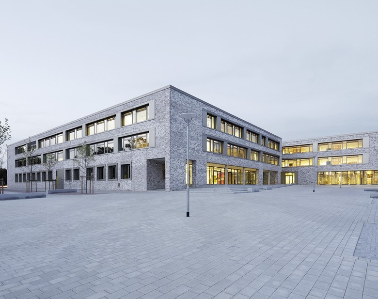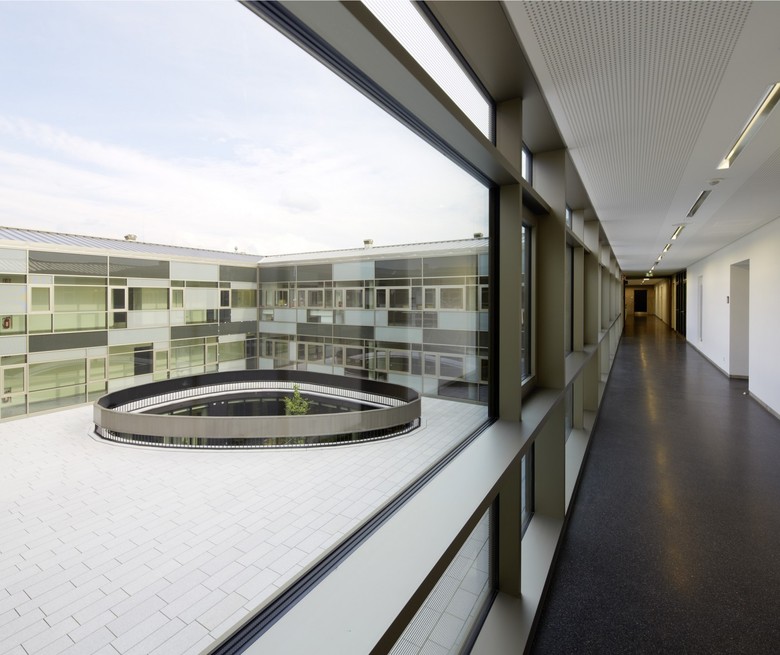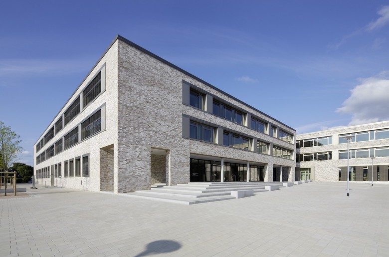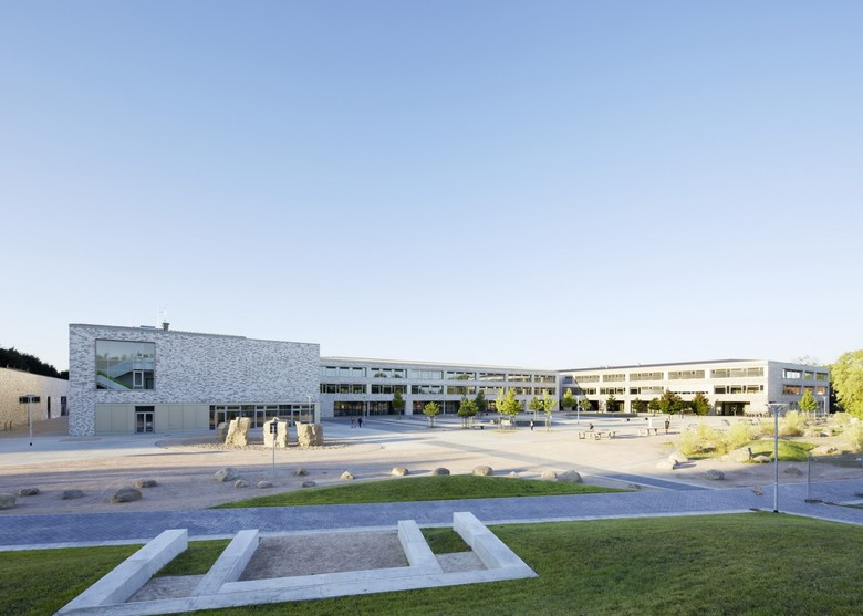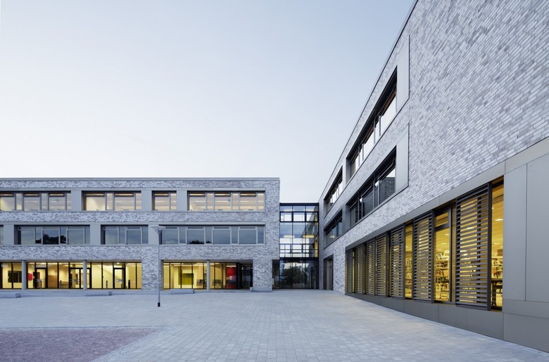 Der Schulhof erhält durch den Neubau eine kräftige, räumliche Fassung nach Süden und Westen und mit überdeckten Arkaden einen funktional und architektonisch attraktiven Zugang von den Park- und Fahrradstellplätzen.