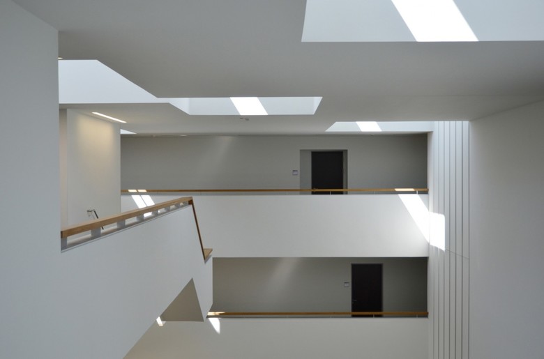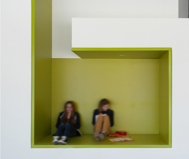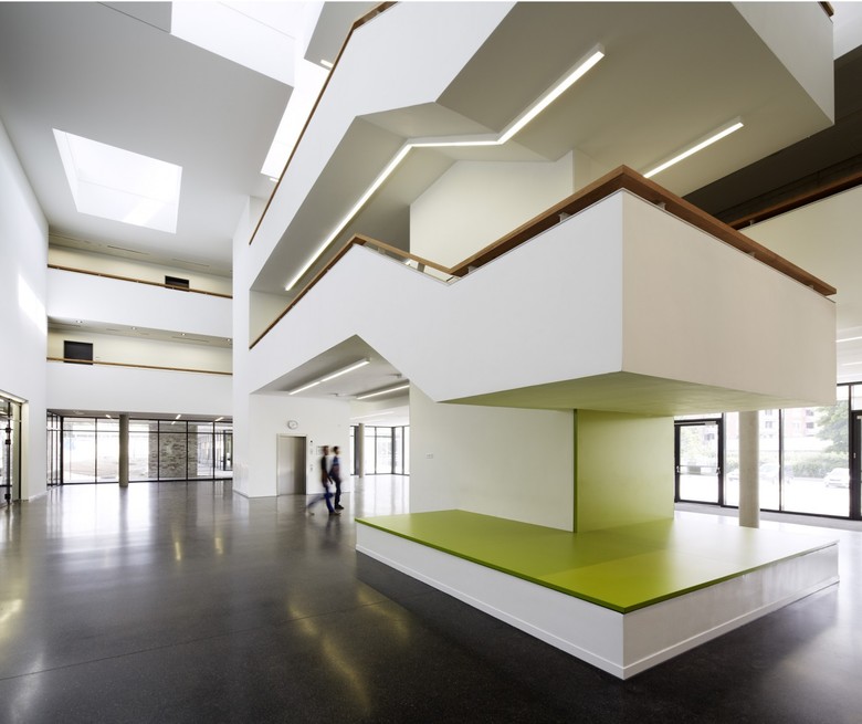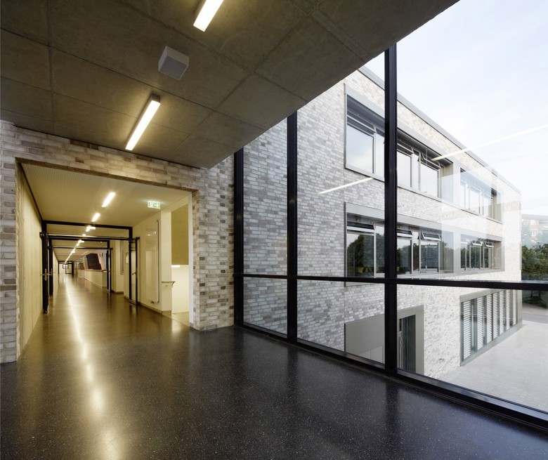 Eine interne Verbindungsachse durch alle Bauteile - die Schulstraße - ist für den Schulbetrieb von zentraler Bedeutung. Alle wichtigen kommunikativen Bereiche sind in wechselnder Weise an diese Achse angegliedert. Räumlich attraktiv, vielfältig gegliedert und natürlich belichtet bildet sie den zukünftigen Lebensnerv der Schule. Innenräumliche Höhepunkte bilden die mehrgeschossigen Hallen und Höfe in den einzelnen Schulhäusern.
