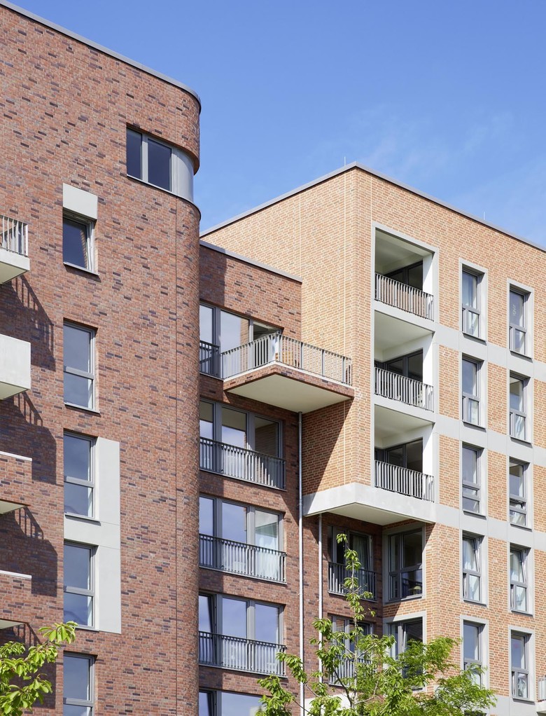 Für die Umsetzung der Materialvorgabe „roter Ziegel“ dient als Referenz die neobarocke Architektur Hamburgs, wie z.B. das HHLA-Gebäude in der Speicherstadt, die mit ihrem Spiel von Ziegel und Naturstein besonders geeignet zu sein scheint, ein gleichermaßen anspruchsvolles wir wohnliches Ambiente zu erzeugen.