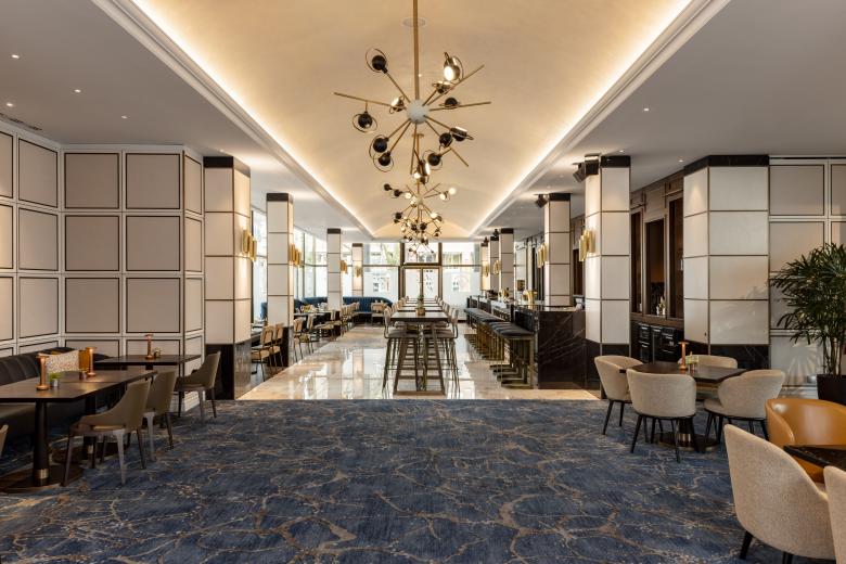 Goddard Littlefair inszeniert mit schwarzen Fliesen in Marmoroptik, dunklen Holzverkleidungen, gespiegelten Bodenfliesen und Gold schimmernden Messingelementen einen klassischen, modernen Look, das dank einer durchgehenden neuen Deckenflucht im Gesamtbild nun leichter, heller und einladender auf die Hotelgäste wirkt. Der lange und offene Tresen tritt optisch für Besucher als markantes Highlight in den Vordergrund. Die Möbel kombinieren Metropolitan Glamour mit rauem, klassischem Schick.