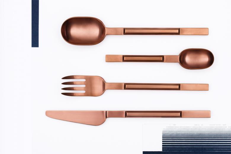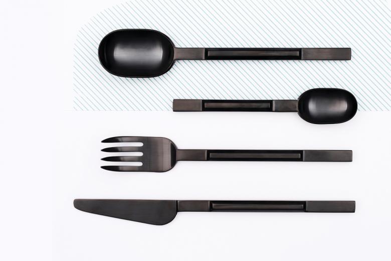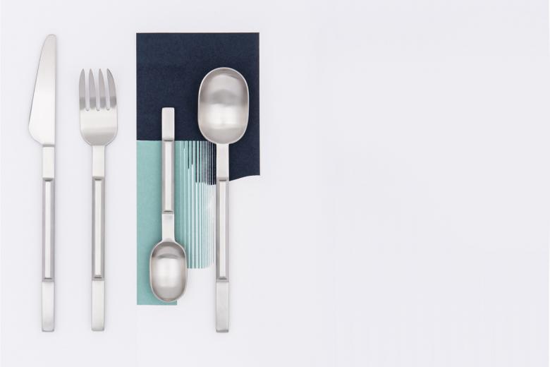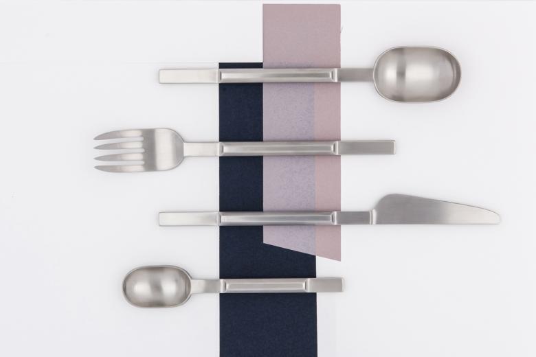 八角形とその両端のフラット面が解け合うボディ形状をしたカトラリー。二俣が普段から愛用していた八角形のシャープペンシルからインスピレーションを受けデザインされた。持ち手のメインを八角形、その先端と末尾にかけてはカトラリーに一般的なフラット面を残すことで、機能的な握り心地やコントロール上の手当たりの良さを備えている。用途に応じた様々な握り方をしても常に手に馴染む形状が、結果として特異なフォルムを生んだ。