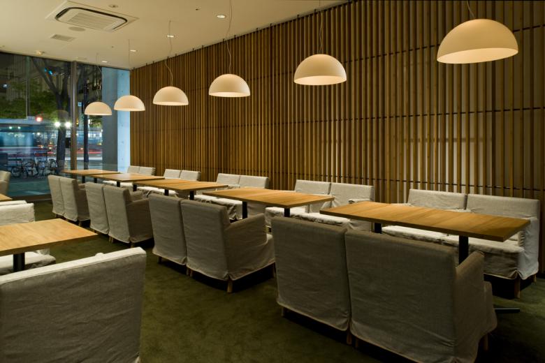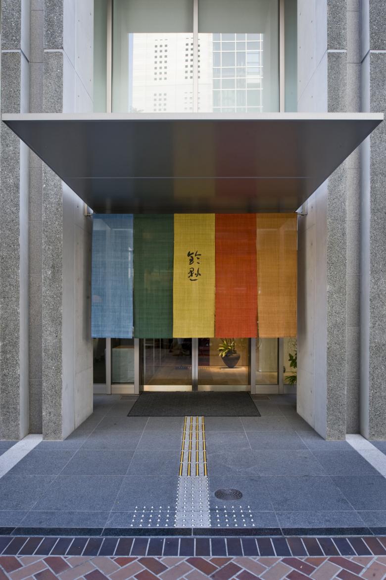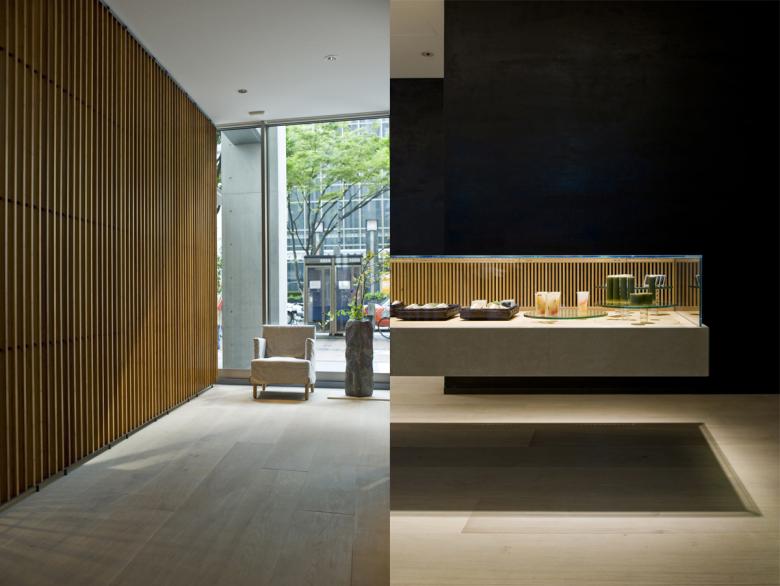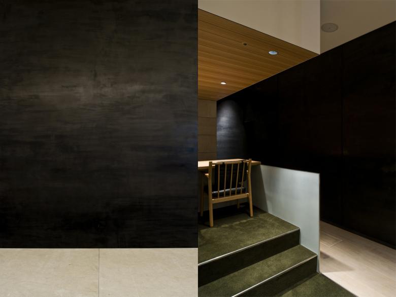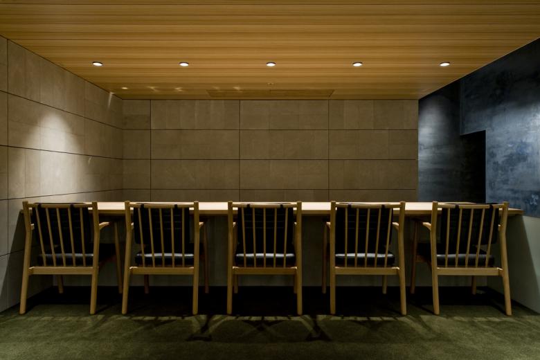静寂に包まれる漆黒の菓舗・・・歴史ある商人の町、福岡市博多区上川端町での和菓子屋の計画。菓舗と茶舗を有するこの和菓子ブランドの旗艦店である。この 店舗にとって菓子を扱う場所こそが最も神聖な場所であるという思想の元、ここでは路面店ながらも菓舗は敢えてメインストリートに接することなく配置され、その雑踏から独立させている。また、菓子のディスプレーケースはその半分以上が宙に浮く長さ9mもの一本のみで、そこに採用した素材やディテール、また背景となる壁面全てを黒漆喰磨きとし真っ黒な無の存在として扱った点などこれら全ては無垢で素朴な菓子の存在を際立てるための配慮である。対照的に茶舗は通りからも容易に内部が認識出来るオープンな環境とし、この茶舗の為にオリジナル制作された家具が並ぶ。エントランスは、風合いある五色の暖簾と重厚感ある本朱の漆看板によって艶やかに彩られ、その先にあるものへの期待を象徴する存在とした。