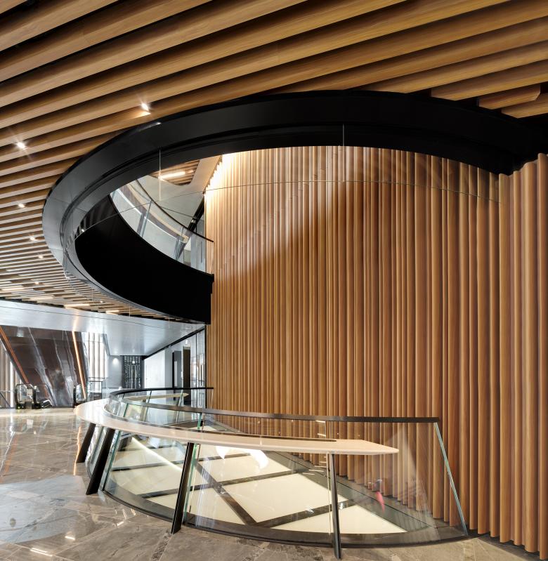 A grand spiral stair connects the second to the third level 4,300m² podium garden, equipped with a jogging path. The criteria for a WELL certification that includes air, water, nourishment, light, fitness, comfort and mind are carefully integrated to achieve a healthy work place amidst a stark, industrial context being transformed.