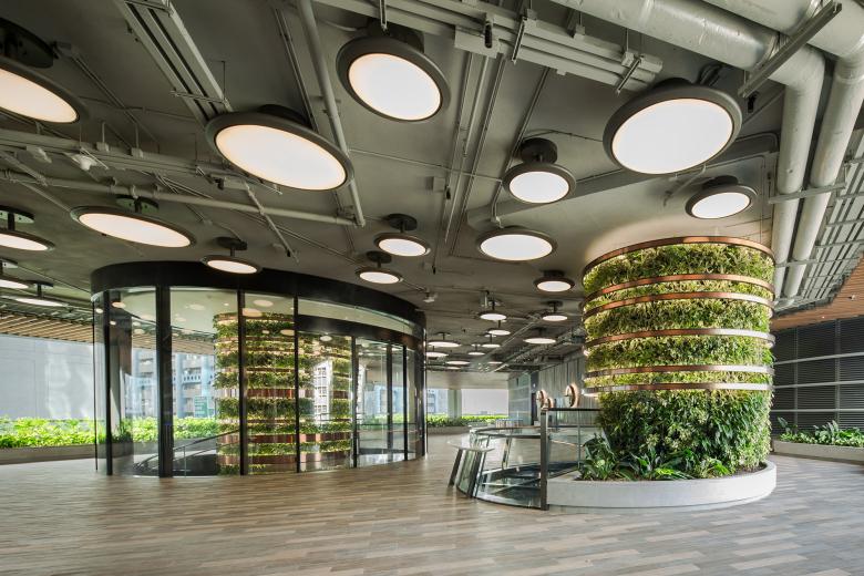 With the office lobby on the ground level, retail on the first and second levels, and a large green podium on the third level, circular openings were created to visually connect and integrate the various functions, while planting with self irrigation and lighting system forms column structures puncturing through these openings.