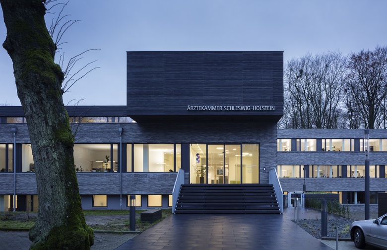 In bester Lage Bad Segebergs direkt am Kurpark befindet sich der 1976 fertiggestellte Verwaltungskomplex der Ärztekammer des Landes Schleswig-Holstein. Ein erhöhter Bedarf an Nutzfläche und die heute unzureichenden Möglichkeiten für eine professionelle IT- Infrastruktur warfen die Frage nach Abriss und Neubau oder Sanierung und Erweiterung auf. Aufgrund der soliden Bausubstanz und der zeitlos klaren Kubaturen des versetzt zueinander stehenden Verwaltungs- und Seminargebäudes entschieden sich der Bauherr und die Architekten für letztere Lösung. Die angestrebte Kernsanierung beinhaltete neben einer Modernisierung zur Verbesserung des Arbeitsklimas und einer funktionalen Optimierung der Eingangs- situation und der internen Verkehrswege vor allem eine energetische und anlagentechnische Ertüchtigung. Die Flächenerweiterung wurde mit dem Aufsatz eines Staffelgeschosses gelöst.