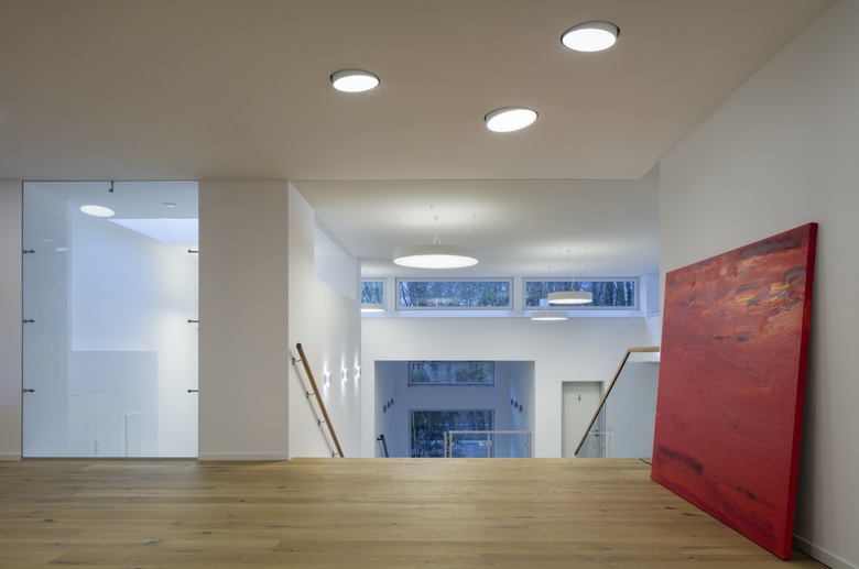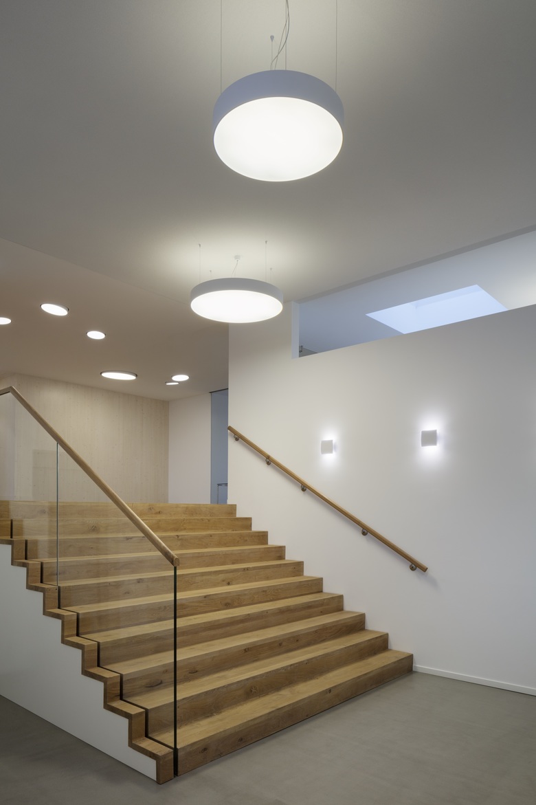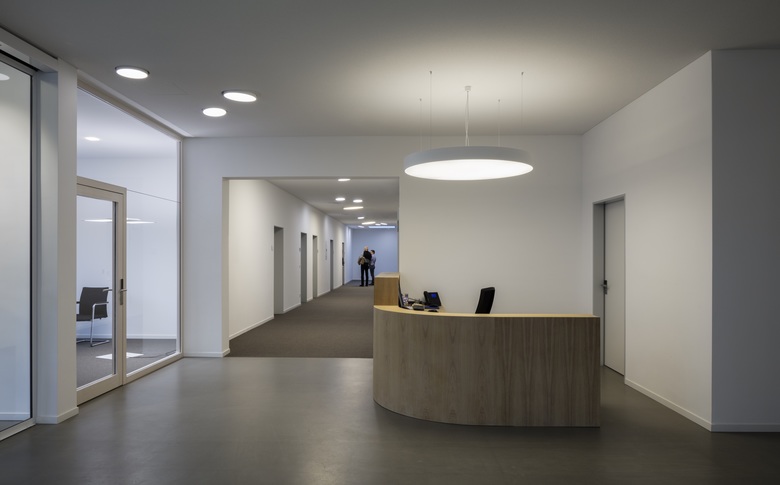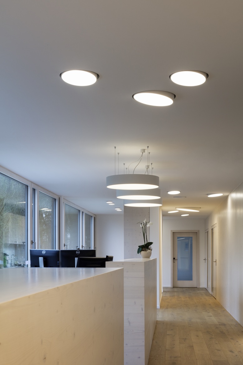 Durch eine gläserne Tür betritt man das Treppenhaus aus den 70er Jahren, welches in das 2. Obergeschoss des Verwaltungsgebäudes und von dort mittels einer breit ausgebildeten Holztreppe als Split Level in das 400 qm große Staffelgeschoss führt. Vier große direkt / indirekt strahlende Supernova Pendelleuchten begleiten den Passanten auf seinem Weg nach oben, wo er wiederum von verschieden großen Deckeneinbauvarianten empfangen wird. Mit ihrer spielerischen Anmutung setzen die Leuchten einen heiteren Kontrapunkt zu der strengen Kubatur und der zurückhaltenden Möblierung. Im Foyer und Flur des Erweiterungsbaus setzt sich das Holz der Treppe, dessen warmer Honig-Ton und deren Oberflächenstruktur von dem Kunstlicht hervorgehoben werden, als Bodenbelag fort. Auch hier gibt es einen Rezeptionstresen, der sein künstliches Licht von Supernova Pendelleuchten erhält, während für die Allgemeinbeleuchtung wieder die neigbaren Einbauvarianten eingesetzt wurden.